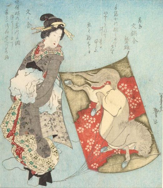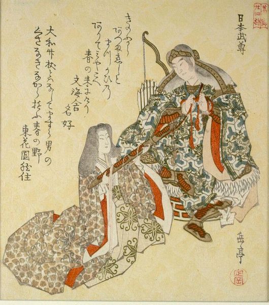 Curator: Yashima Gakutei's woodblock print, "Takenouchi no Sukune," presents a figure from the Katsushika Circle's Twenty-Four Generals series. Editor: It has a quaint, almost naive quality to it. The textures are wonderfully tactile, but the overall effect is quite flat. Curator: The composition emphasizes a hierarchy of power through spatial arrangement. Note the general's elevated stance, contrasting with the kneeling figure. The formal robes and the geometric patterning reinforce his authority. Editor: Looking closely, the patterns on the kneeling figure's garments seem almost to merge with the ground. The labor involved in creating these detailed woodblocks is also something to appreciate. Curator: The interplay of line and form creates a dynamic visual experience. The artist has skillfully employed negative space. Editor: Agreed. It's a lovely piece, reminding us of the detailed work and social context behind these prints.
