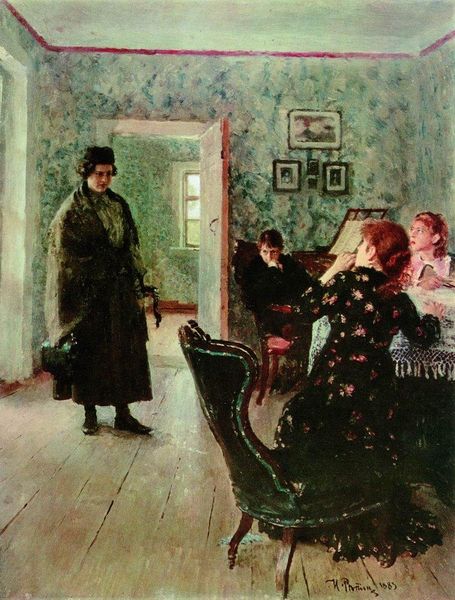 Curator: The overall impression I get is that of warmth despite the clutter. Editor: Indeed, Alexei Korzukhin's "In the Red Corner," painted in 1875, presents an intimate, yet somewhat obscured domestic scene using oil paint. A woman is seen facing a shelf of religious iconography, and she is the focus of attention here. Curator: Right. The way the woman stands, absorbed in what she's doing before the icons, definitely pulls you in. You feel a sense of quiet reverence or dedication. Is there something specific to be said about the light source in the room that draws this out? Editor: Absolutely, I think so. Look at how the glow illuminates her face and the icons themselves, drawing your eyes to that corner. The icons symbolize a connection to the divine, obviously, but also to the past and perhaps to ancestral traditions being upheld, which carries profound cultural weight. The scattered items around the room might denote daily life and also challenge idealized piety. What is happening with her psychology that this tradition has the impact of solace? Curator: That is precisely the tension which makes this work so fascinating to consider from a historical lens! There's almost a push-and-pull in the composition. The rigid symmetry implied by icons is interrupted by the painterly and deliberately casual way that paintings or prints adorn the wall, showing varying sizes and depths of their hanging. What do you think the artist might want to say about that type of juxtaposition? Editor: Possibly about shifting cultural values at the time it was painted? Perhaps exploring the dialogue between sacred tradition and emerging secularism through contrasting textures, and creating a dynamic where personal expression begins to mingle with established devotional forms. Curator: That is a lovely and necessary way to synthesize our discussions of it, I think! So even beyond this individual and her personal act of worship, there's this implication of broader changes afoot within society. Editor: Exactly, I can feel that this realistic scene and how this has played out, is only a piece of a broader tapestry. A story unfolding just beyond the edges of the canvas. Curator: What a powerful, but simple depiction to encapsulate change within society! Thank you for walking us through this history.