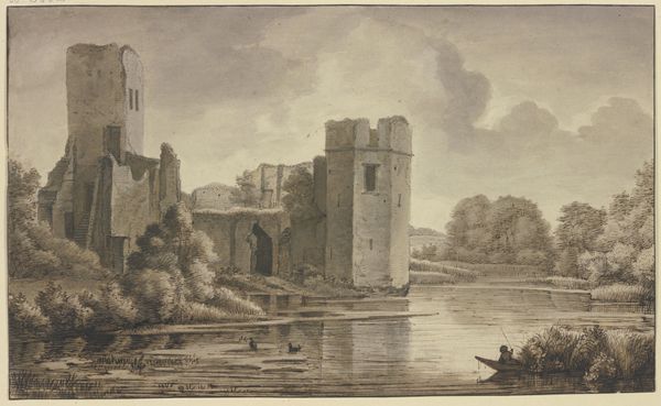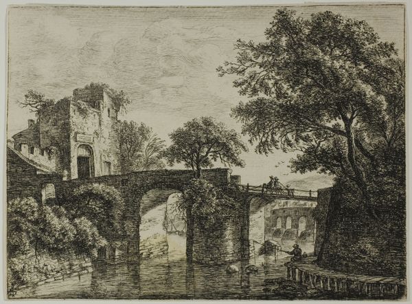 Curator: Rev. Edward Pryce Owen, born in 1788, created this print titled "The Old Welsh Bridge, Shrewsbury (after Paul Sandby)." What are your first impressions? Editor: It has a somber tone, wouldn't you agree? The stark blacks and whites create a dramatic contrast, emphasizing the bridge's imposing structure and the river's reflective surface. Curator: Indeed. Owen's print, made after an image by Sandby, speaks to the picturesque movement and its fascination with ruins and the passage of time. Consider the social implications of idealizing decay during the rise of industrialization. Editor: The composition itself is striking. The bridge dominates the left side, its architectural details meticulously rendered. The negative space of the sky balances the dark mass of the bridge, drawing the eye across the scene. Curator: This bridge, and its representation, becomes a focal point for understanding identity and place within the context of early 19th-century Britain. How does this imagery reflect or challenge the period's social hierarchies? Editor: The strategic use of light and shadow to define form gives the print a sense of depth. Owen masterfully employs hatching and cross-hatching to create gradations of tone, highlighting the texture of the stone and the ripples on the water. Curator: A fruitful exchange that enriches our understanding of this piece. Editor: It certainly illuminates the interplay between form and context.
