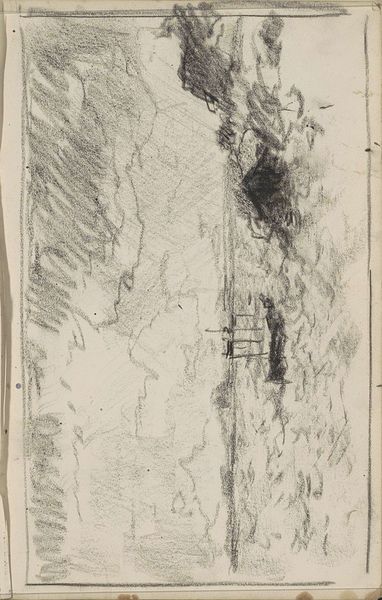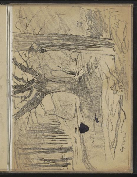 Curator: Looking at this piece, one immediately senses a fleeting quality, wouldn't you agree? Editor: Absolutely. There's a raw immediacy to it, almost like a charcoal memory. I’m struck by the layering of graphite, building a somewhat ethereal depiction of the landscape before us. Curator: Indeed. The work is entitled “Landschap met bomen,” or “Landscape with Trees,” created by Anton Mauve sometime between 1848 and 1888. It’s a pencil drawing. Editor: Pencil lends itself so well to capturing a mood. Are those trees along a riverbank? They remind me of trees found in 19th-century Dutch art; skeletal silhouettes that hint at cycles of death and renewal, resonating with societal concerns about nature during that time. I notice how Mauve doesn’t offer us detail; rather, gestural marks evoke form. Curator: It’s compelling, how Mauve employs such a humble medium to evoke the vastness of nature. It makes me consider the economic and political landscapes of the time, too. During that period, landscape art gained momentum alongside urbanization. How did everyday people understand nature amid rapid social change? I suppose art was there to remind them of a simpler life. Editor: Precisely, I’m always wondering about what art can mean to diverse populations across generations, especially within times of economic and political hardship. Take the darker areas, where graphite is layered to convey volume. These strike a psychological cord, a sense of shadow, perhaps alluding to darker aspects of this simplicity? Curator: A compelling observation. I’d suggest this shadow is part of Mauve’s social commentary and exploration of environmental changes during this time. Editor: Ultimately, that contrast and ambiguity is what stays with me. The rapid sketching seems like a portal to memory and symbolic landscape, capturing a particular essence of nature beyond direct realism. Curator: Well, looking at this, I agree about the simplicity and evocative mood of Mauve's statement about the land.