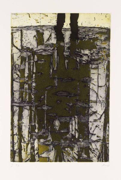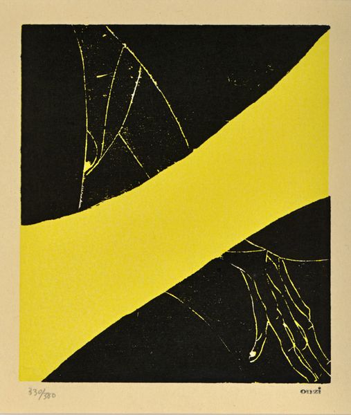 Editor: Standing here, I'm drawn to Robert Mallary’s “Wall,” created in 1962. It's a striking monoprint, featuring strong black and ochre vertical lines that really give a sense of enclosure, or maybe even defiance. What sort of historical context should inform our appreciation of it? Curator: Well, this piece, arriving in the early 60s, situates itself within a fascinating intersection of art history and social tension. Abstract Expressionism had paved the way for artists to explore non-representational forms, emphasizing process and material. Given the prevailing concerns with socio-political themes, how does Mallary’s seemingly simple 'Wall' participate in or react to such concerns? Editor: Hmm, that's interesting, especially thinking about its title "Wall". It does give the impression of something meant to block or protect. Curator: Exactly! Consider the sociopolitical climate: The Berlin Wall was erected in 1961, heightening Cold War anxieties. In this context, the "wall" becomes a powerful metaphor. We need to think about the symbolic nature of walls, right? Is it just a physical barrier, or something else? Editor: I hadn’t thought about it in those terms! Looking at it now, I see less of a simple design and more of a…statement. Those uneven lines, almost aggressively vertical, they seem almost tormented. The layering adds a certain weight, and the color combination also does not make it inviting. Curator: That's an astute observation! Think of matter-painting; Mallary built up the surface to suggest both construction and potential destruction. So, instead of just a simple barrier, what feelings do you think the wall conveys at that moment? Editor: I see it as a commentary of power. Barriers aren't just structures; they dictate interactions and behaviors of groups of people. They can define, confine, separate... Curator: Precisely. By deconstructing the expected visual harmony, he's pushing the audience to critically consider our relationship with socio-political structures that defined the world. He is creating something new that contributes to our thinking around a global matter. Editor: I definitely will now! Seeing the work this way reveals a depth that I really missed. It goes beyond mere aesthetics. Thanks for pointing that out! Curator: My pleasure! Looking at it in relation to society emphasizes the power of visual culture and its reflection on reality. Art becomes a mirror of society's challenges, but also holds power to challenge conventions and social assumptions!