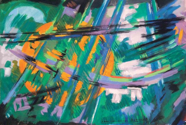 Editor: This is "Landscape of a Waterway," painted in 1908 by Auguste Herbin. It’s an oil painting that, for me, feels like a joyous explosion of colour, though with a somewhat unsettling geometrical feel to it all. It's clearly a landscape, but it's almost been translated into code, or a stained-glass window. What jumps out at you when you look at this piece? Curator: Ah, yes! It's as if Herbin bottled a sunny afternoon and let it ferment. What emerges isn’t literal nature, but the potent essence of it – the dizzying contrast of shadows and light. It looks like it might reflect his engagement with early Fauvism. I sense Herbin letting go of rigid representation. Are you picking up the slight tension, though? Like nature viewed through the lens of Cubism still gestating? Editor: Definitely the geometry! The blocks of colour give it that structured, almost architectural feel. Is that unusual for landscapes of this period? Curator: Well, landscape painting at the time was often more about capturing fleeting moments, think Impressionism. Here, though, Herbin seems to be grappling with the underlying *structure* of the natural world, rather than just its surface appearance. He isn’t merely reflecting nature, he is reinventing it on his own terms! How does it sit with you now? Editor: I like that. It's more than just pretty scenery; it's a thoughtful interpretation. I didn't know it was flirting with Cubism, but the perspective definitely adds depth to how I look at the whole composition. It’s like, beyond the colour, there is almost a code of nature that he's hinting at. Curator: Precisely! Perhaps, in that little landscape, we catch a glimpse of what Nature *means* to him, and potentially to us! I certainly leave this landscape feeling enriched.