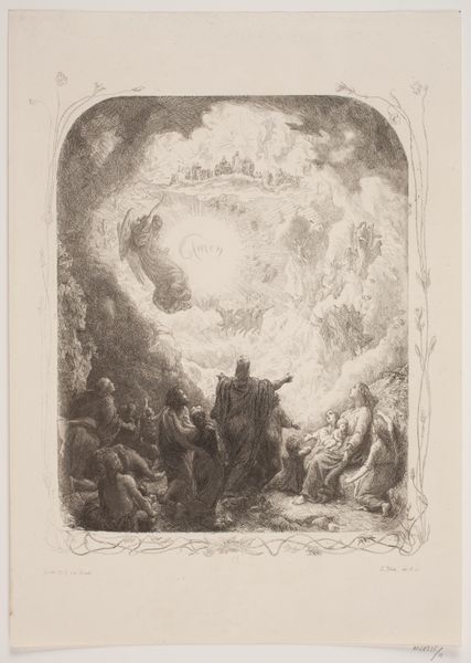 Lorenz Frølich created this illustration to "L'Oraison Dominicale" using monochrome drawing techniques. Immediately, one is struck by its chiaroscuro effects where light and shadow interplay. The composition is divided into two distinct spatial zones: above, we see radiant light with ethereal figures, which contrasts dramatically with the chaotic, darker scenes below, filled with struggling human forms. The artist uses line work to define shapes. The intricate details in the figures' expressions and the textures of the natural elements. Consider how Frølich uses this contrast to explore themes of divine guidance versus human struggle. The overall effect is to draw the viewer into a meditation on the duality of existence, between the spiritual and earthly realms. Frølich uses the formal aspects of light, shadow, and composition to create a complex visual narrative about faith, struggle, and redemption.