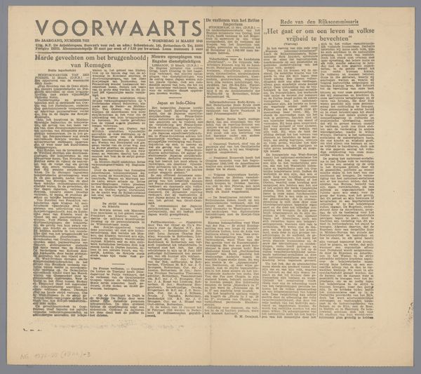 This is a newspaper called "Voorwaarts" by H.M.C. Schröder. It looks like it was made in February 1945, probably printed with ink on paper. Newspapers. Think of them as a kind of process-oriented art, where each day's edition builds on the last, layering stories and perspectives. Look at the density of the text, like a field of marks, so many little gestures, all accumulating to make a whole. The texture of the paper and the ink creates a tactile experience. You can almost feel the newsprint on your fingertips. A particular headline stands out – something about Hitler. That bold, declarative statement amidst the columns of text really catches the eye. It's a stark reminder of the historical context in which this newspaper was created. It reminds me a little of Kurt Schwitters' collages, where fragments of everyday life are assembled into new forms. Both artists embrace the ephemerality of their materials. Both artists allow ambiguity to thrive, inviting us to question what we see and how we interpret it.