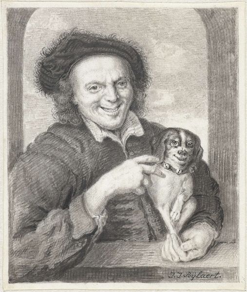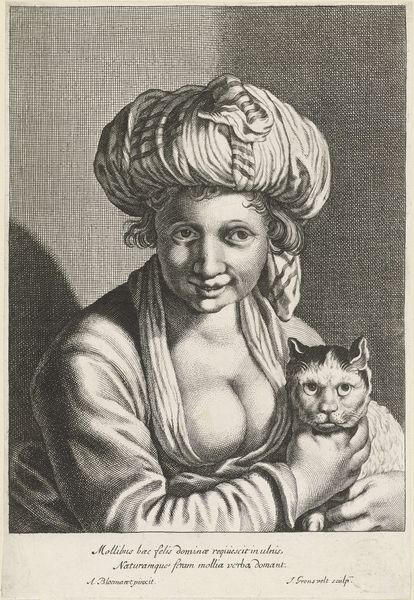 Curator: This is “Boy with Cat,” a print made around 1625 by Cornelis Bloemaert. It’s currently held here at the Rijksmuseum. Editor: Well, my immediate response is… awkward. There’s an ungainliness to the boy’s pose and facial expression that is deeply unsettling. Curator: Ungainly? Interesting. Bloemaert’s skill with line work is definitely on display. The dense hatching and cross-hatching create a wide tonal range, which is quite effective in rendering textures, from the boy’s hair to the soft fur of the cat. Notice how the lines curve to suggest the rounded forms? Editor: Yes, technically proficient, no doubt, but in service of what? This composition feels claustrophobic. The dark, almost featureless background pushes the figures forward, and the boy’s awkward hold on the cat… it’s almost painful to look at. One has to consider this from an art historical position of similar genre paintings of the Dutch Golden Age. Is the intent here sentimental or perhaps a broader commentary on domesticity and social class? The choice to immortalize this, of all subjects. Why? Curator: That’s a valid perspective, of course, the artist, in some manner, tries to capture a particular aesthetic. Think about the lines of the robe the boy wears— how they seem to be falling off his shoulder, or the way the collar sits almost loose; Bloemaert isn’t after the smooth elegance, of course, so one can read that decision into other areas. The engraver deliberately renders texture imperfectly, making it something other than just skin or fur. The subject, therefore, is being handled in an abstracted, geometric form. The work uses light, tonality and form for its expression. Editor: But at what cost to the representation of human relationships? Considering this piece amidst similar Baroque portraits, I wonder what statement Bloemaert was aiming to make, or perhaps subvert. Curator: I suppose you find its lack of symmetry and grace bothersome? Despite this asymmetry in structure, in its purest construction, it does provoke discourse with the relationship of the artwork’s many forms with each other. Editor: Perhaps you are correct, I cannot dismiss the idea this composition prompts more questions than delivers visual peace; regardless of the success in creating this harmony of many lines, shades, lights and construction it definitely delivers something. Curator: Absolutely, indeed, the engraving allows a reflection on more than it depicts at first glance.