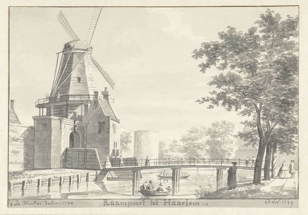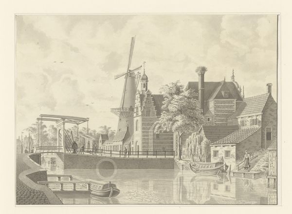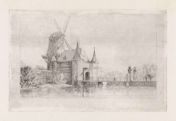 Curator: Looking at Verspuy's pencil drawing, “Kleiwegpoort te Gouda,” likely completed between 1833 and 1862 and currently held in the Rijksmuseum, I immediately notice its melancholic stillness. The muted tones evoke a sense of quiet introspection. Editor: Yes, there’s an immediate quality of industry subdued; you sense the presence of human activity through the windmill and architecture, yet it’s utterly depopulated, hushed. What I appreciate is the artist's commitment to detail in rendering the textures of the stone and water using only pencil. Curator: Exactly! Consider the socio-political context. Was Verspuy perhaps subtly critiquing the social disruptions caused by industrialization through the deliberate depopulation and rendering of architectural relics of a bygone era? The Kleiwegpoort itself would have represented a boundary, both physical and symbolic, dictating access to and from the city of Gouda, reinforcing power dynamics and controlling the flow of both people and resources. Editor: And yet it is made accessible, both formally through the bridge construction in the foreground and iconographically through the accessibility that drawings have. There is the immediate function of boundary construction of this physical location. Drawings, affordable to many and transportable, allowed for greater distribution to social classes to see and understand these forms of power. We must account for paper production, too—how were those materials made? Who produced those materials and for whom? Curator: A pertinent question. Was the creation and viewing of such artworks a privilege reserved for the upper echelons of society? Whose narratives were prioritized through this visual representation of place and space? We also need to reflect on whose histories may have been omitted or misrepresented in this carefully composed view. Editor: Precisely. And the artist’s labor – his precise pencil strokes, the time invested in observation and translation onto paper; it's a skilled practice deeply embedded in social hierarchies of production, particularly as the division of labor stratified throughout the long 19th century. Curator: The muted color palette, or lack thereof, emphasizes the subject in its structure and utility. Examining the history of Gouda at this time, and Verspuy's connection to its cultural climate, allows us to delve deeper into the possible motivations behind this particular subject. Editor: Yes. When observing art, considering both the object itself and the broader circumstances of production— the human labor, raw materials, and means of dissemination– can provide essential insights beyond formal analysis. I believe a close look reveals much about the values and inequalities within Verspuy’s time. Curator: Ultimately, it’s about broadening the conversation surrounding a work like this, moving beyond simple appreciation to engage with more complex, sometimes uncomfortable truths about the society that produced it. Editor: Agreed. Seeing both art and society this way can lead to critical reevaluations that can create positive transformation in ourselves.