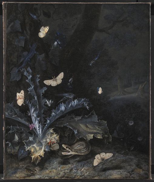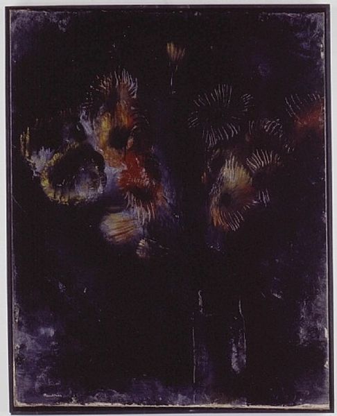 Curator: James Abbott McNeill Whistler created this watercolor painting, sometime between 1872 and 1876. It’s known as "The Blue Girl." Editor: "Blue Girl?" It looks like a vase overflowing with flowers! Gloomy, a touch wistful. Like a forgotten corner of a garden after the rain. Curator: Indeed. The "Blue Girl" title may seem misleading, yet Whistler's use of color creates a unifying atmospheric effect. The vase, predominantly blue, subtly anchors the composition. Considering color psychology, blue is associated with depth, stability, and calm... but also sadness. Editor: Right, I get that sadness—almost like these beautiful flowers are slowly dissolving back into the shadows. Whistler often blurred lines. Everything kind of bleeds together. Is that something intentional? A reflection of the impermanence of beauty, maybe? Or fleeting moments? Curator: Precisely! Whistler was deeply influenced by Japonisme. You'll note the subtle asymmetry. There's also a focus on capturing a fleeting impression rather than meticulous detail. Notice how the background seems to fade, drawing our eye to the bloom itself. In Japanese art, this appreciation of the ephemeral is known as "mono no aware." It is a key motif in a watercolor medium. Editor: Mono no aware… Beautiful. So, the "Blue Girl" is a container. In it the blooms don't necessarily have individual identities, but they merge within it, suggesting both containment and the flow of emotions. A vessel, really! And even the tall iris at the back reaches above that sense of melancholy. Almost defiant. Curator: Excellent! Also consider that, traditionally, flowers symbolize various things: love, beauty, remembrance... Whistler is not interested in exactness of any one concept; the vagueness is a language of emotion. Editor: He certainly lets us interpret things! It's evocative... Makes me think of poems by Baudelaire, steeped in spleen and yearning. Even with beauty, we have melancholy and mystery. The artwork evokes more than just observation of flowers, it is very contemplative! Curator: Whistler encourages the viewer to respond viscerally. In Japanese thought, one can contemplate any object, natural or otherwise, and it has potential for spiritual insight. The container provides an armature for the flowers that may otherwise go unnoticed. It is both a vessel and a symbol for the ineffable. Editor: Very true! In the end, you can choose to let the gloom overtake you or… celebrate what's beautiful, before it’s gone. Curator: Nicely put! That sums it up beautifully!