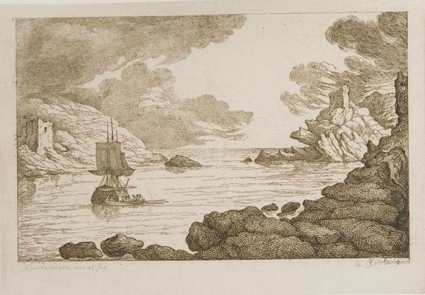 Editor: This is Jean Jacques de Boissieu’s "Breach of a Dam in Holland." I'm drawn to the churning water; there's a sense of nature's raw power, and the figures almost seem inconsequential against it. What do you make of it? Curator: Absolutely. I get a real sublime feeling, don't you? The tiny figures are spectators, dwarfed by the breach. Boissieu captures that 18th-century fascination with nature’s capacity for both beauty and destruction. The etching technique really heightens the drama. Does it make you wonder about human intervention and its consequences? Editor: It does. I hadn't thought about that connection, but it adds another layer to the piece. Curator: Right? It’s a conversation between humanity and nature, frozen in ink. A memento mori in landscape, perhaps?