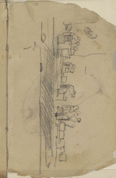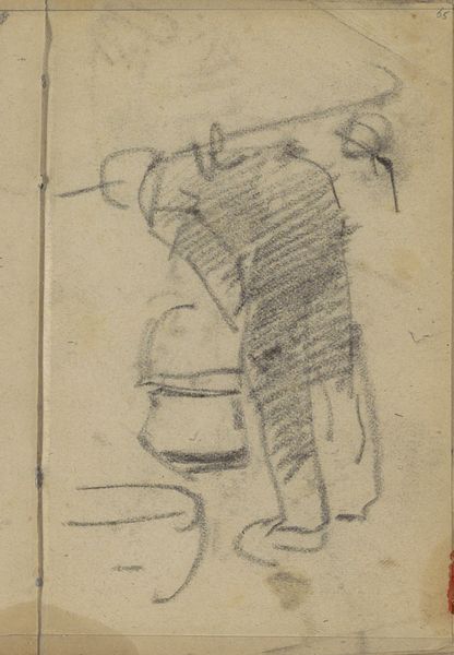Curator: This sketch by George Hendrik Breitner, titled "Figuren aan het werk, mogelijk nettenboeters," translates to "Figures at work, possibly net menders," and dates back to around 1881-1883. It’s part of the Rijksmuseum's collection and provides a fascinating glimpse into the artist's process. Editor: My initial reaction is that there's an immediacy, a raw quality, in these rapidly sketched figures. The toned paper gives a warmth, despite the cool precision of the pencil lines. It feels like we're looking over Breitner's shoulder, capturing fleeting moments of labor. Curator: Exactly! It is likely from a sketchbook. Notice the careful observation of form and gesture. Breitner's drawings often explored urban life, but here, we see figures possibly engaged in more traditional work, perhaps in a fishing community. What might that mean? Editor: I think this points towards a very specific representation of labor, maybe a romanticizing one. The sketch offers, on one hand, a possible view into the lives of working-class individuals mending nets, yet this very portrayal exists only through the lens and hand of a bourgeois artist like Breitner, whose life differed immensely. This calls for questions about authenticity and the power dynamics inherent in image making. Curator: That is a valid point, the figures are presented almost reverentially, with simple directness. The sketch style avoids embellishment and sentimentality—Breitner captured just enough to convey the essence of these working people. How does the context of rapid industrialization play a part here? Editor: Absolutely. Industrialization transformed the Netherlands at the time, drawing many from these traditional sectors and communities towards the cities, for work in factories, that often paid much less. Breitner's capturing these "net menders," freezes a moment that industrial advancement threatened to make obsolete. He sketches them possibly unaware of how history will affect their lives. This imbues a quiet social critique: not as some glorious romantic painting, but as an attempt to capture the fleeting existence of this work culture. Curator: The contrast between the ephemeral nature of a sketch and the enduring presence of the work is compelling. Even unfinished, these figures have an undeniable weight and presence. I can see here how Breitner’s sketching is tied to observation and respect for humanity. Editor: And it reminds us of our responsibility to critically engage with such representations. It pushes to consider whose voices are amplified and whose are omitted in the story being sketched, demanding ongoing dialogues. Curator: This sketch becomes a reminder, perhaps a subtle memorial, etched on toned paper. Editor: Agreed. Art becomes an important artifact of remembering overlooked histories.