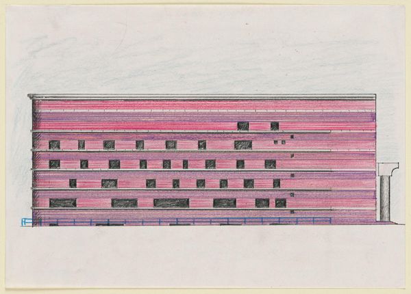 Curator: This is James Stirling's "Drawing for the Arthur M. Sackler Museum, Axonometric Color Study for Cambridge and Quincy Street Elevations." Editor: My first impression is the dominance of linear form. The parallel red bands rhythmically segment the building’s facade, a striking visual statement. Curator: Indeed, the color study reveals Stirling's engagement with materiality. The red bands, perhaps indicative of brick, are crucial in understanding the building's eventual construction and how its appearance was meticulously planned. Editor: But these simple red bands do more than indicate material; they dictate the entire visual field! Their repetition flattens the perspectival depth, creating a dynamic tension between two and three dimensions. Curator: This tension mirrors the building's context. Stirling's design sought to reconcile the monumental demands of a museum with the urban fabric of Cambridge. The materials used and their presentation address this. Editor: The drawing embodies an architectural concept! Its semiotic play with line, color, and form makes it an engaging piece of visual rhetoric. Curator: Precisely, and by studying the drawing’s medium and method, we gain insight into the building's socio-historical situation. Editor: Right, the power of simple lines.