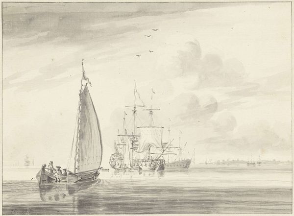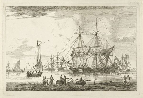 Curator: So, here we have "Havengezicht," a cityscape scene by Gerrit Groenewegen, probably etched sometime between 1764 and 1826. It's currently held at the Rijksmuseum. A classic harbor view! Editor: Immediately, I'm drawn in. It's like looking through a gauze, a distant memory rendered in ink. So many ships, all busy with their own stories, the air itself seems to shimmer with a kind of hazy, historical light. Curator: That haze likely comes from the printmaking process, the fineness of the lines. But look at how Groenewegen uses those delicate lines to depict a bustling port. You get a real sense of 18th-century maritime activity, the everyday rhythms of trade and transport. It is like stepping into a slice of Dutch life back then. Editor: True, it’s buzzing! I wonder, though, if there’s a hint of melancholy there too. The monochrome palette, those lone figures… It's not just a record of commerce, is it? Maybe there's something wistful about the endless back-and-forth of leaving and returning? Curator: That’s a fascinating read, given how the cityscape and genre painting elements blend to almost create snapshot of a fleeting historical moment. Also consider that the print, as a multiple, was instrumental in shaping visual culture and creating this shared view, this 'snapshot', for a much larger public than, say, an oil painting might. Editor: Right, making scenes like this more accessible. Like handing someone a little piece of a collective memory. Now that you mention it, that single figure at the bow of the boat in the foreground… It feels like they are a kind of stand-in, a personification of all those onlookers who may never have traveled abroad or set sail. Curator: And it all becomes intertwined: commerce, community, artistic expression—and it has remained like that ever since, thanks to artists like Groenewegen who used print to capture not just the likeness, but also the spirit of their time. Editor: It makes you appreciate how one scene can carry so many stories, so many whispers of a life long past, that resonate even now. The little ghost ships sailing out from the past into our minds...