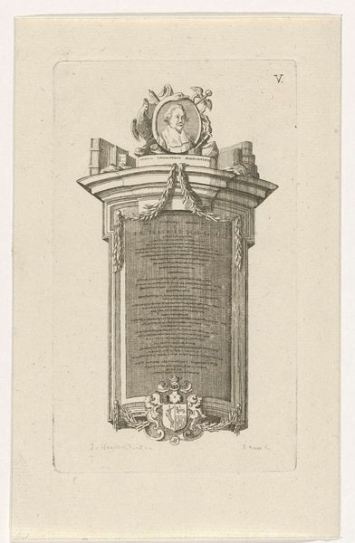 This print by Caspar Jacobsz Philips, dating to the 18th century, depicts a grave monument for Antoni van Leeuwenhoek. It's made using the technique of etching, where lines are incised into a metal plate with acid, then inked and printed. Consider the qualities inherent in the printmaking process: the crisp precision of line, achieved through careful control of the etching needle and the biting action of the acid. The dense network of lines creates shading, depth, and texture, and the contrasts emphasize the graphic nature of the work. The print is a record of the monument itself, memorializing a famous scientist. While seemingly distant from the immediate concerns of labor and class, the print embodies a cultural value system that elevates intellectual achievement and the power of scientific inquiry. The act of memorializing Leeuwenhoek through a print allows for widespread dissemination of his legacy, creating a collective memory and reinforcing the importance of his contributions. By combining the skilled craftsmanship of the printmaker with the monument's design, the work invites us to contemplate not only Leeuwenhoek's scientific accomplishments, but also the intricate social and cultural processes that shape our understanding of knowledge, labor, and enduring legacies.