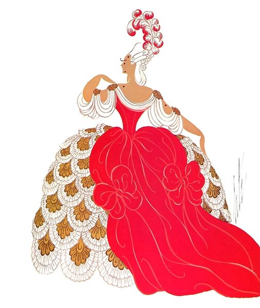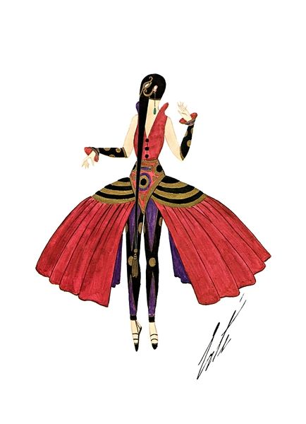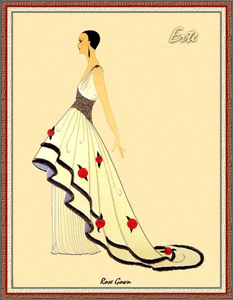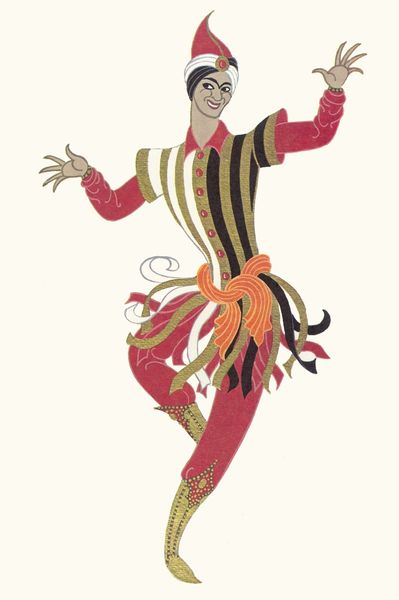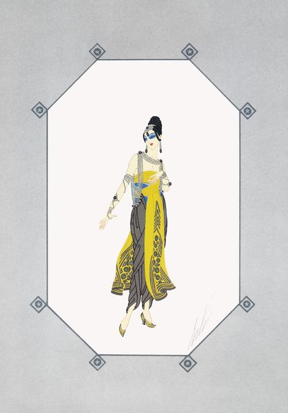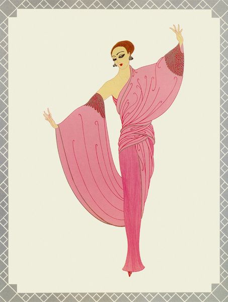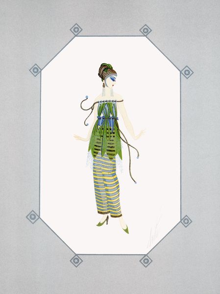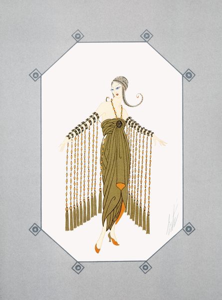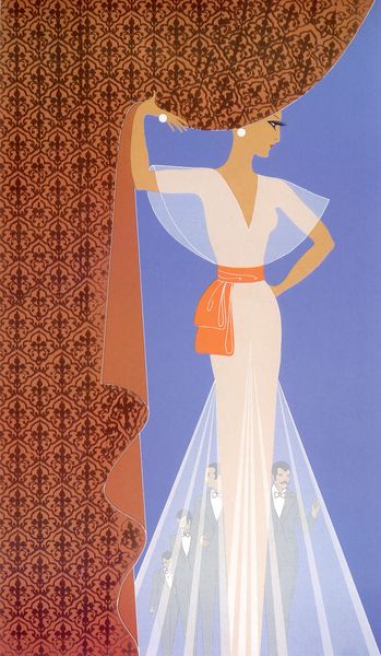 Curator: The stylish silk screen print before us is "The Duel," attributed to the artist Erte, known for his influential Art Deco designs. Editor: Oh, this evokes such a specific mood, a sort of tense, glamorous premonition. The soft colours are disturbed by the stark, shadowed figures…It's dramatic. Curator: Precisely. Erte masterfully blends elements of stage design, fashion, and graphic art. Think of the rise of celebrity culture in the early 20th century and its insatiable appetite for both fantasy and scandal. His work becomes accessible through reproductions and high society embraced these illustrations as aspirational mirrors. Editor: And look at this woman in the centre, she appears serene almost unaffected. The men in shadows behind her indicate an approaching duel, as indicated by the title. Yet, she seems detached, preoccupied with her reflection. This duality is really intriguing. Is she a knowing participant or unaware victim of circumstance? Curator: A key question! Considering the theatricality and recurring duel motif in art during the period, we should explore broader socio-cultural contexts. Such violent events become metaphors for love and jealousy during this time and this adds yet another element for the elite audience, it shows them their glamorous life is not void of serious themes. Editor: It really begs to ask: what is the duel really *for*? The feminine and the decorative, especially within Art Deco, were never separate from broader discussions of power and danger. Her beauty almost *is* the stage upon which this drama unfolds. I can’t help thinking of Klimt or Wilde here! Curator: I think you are onto something! It seems this image serves as a study of gender dynamics of the time, set within constraints, but perhaps more importantly with performance in the upper echelons. What is shown on the surface? And what truly takes place in the shadows? Editor: Absolutely! It's been fascinating looking into this work today and unpicking its elegant but unsettling imagery together. Curator: I fully agree. The historical context really adds new levels of appreciation to it, a fascinating illustration indeed.