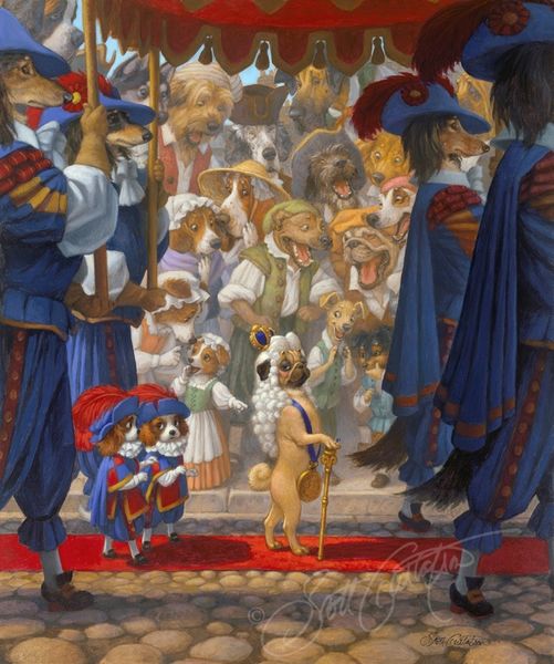 Scott Gustafson painted "The Emperor Loved New Clothes" in the 21st century, although it’s undated, using oil on board. Here, the artist riffs on Hans Christian Andersen’s famous tale of vanity and courtly foolishness. The central figure, a pug in regal attire, is surrounded by symbols of monarchy. He is positioned in front of three ornate mirrors. The image creates meaning through these visual codes of wealth, status, and power which allude to historical courts. Gustafson’s work offers a playful critique of social hierarchies and the absurdity of blind faith in authority, as the artist self-consciously employs a progressive and accessible style, drawing on narrative to engage with broader audiences. Understanding an image like this requires looking into the tales it visually references, as well as how these reflect certain aspects of contemporary social and political trends. The role of the historian is to uncover these layers of meaning. This allows us to reflect on how art can be a tool for social commentary.
