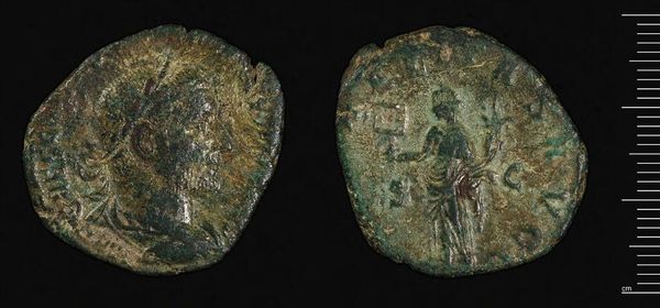 Editor: This is a coin from the Harvard Art Museums, made by Constans II. It's small, and worn with age. What symbols do you recognize in it? Curator: Coins are fascinating because they act as miniature time capsules. In this coin, the figure on one side—likely Constans himself—projects authority, while the large 'M' on the reverse, a Byzantine mark of value, anchors economic stability. What feelings do these symbols evoke for you? Editor: I see power and permanence, like a promise etched in metal, even as the coin itself decays. Curator: Precisely! The imagery attempts to transcend time, yet the coin’s condition reminds us of the inevitable erosion of power and memory. Perhaps its imperfections only deepen its significance. Editor: I see what you mean. The coin now has a new story to tell beyond its intended purpose.