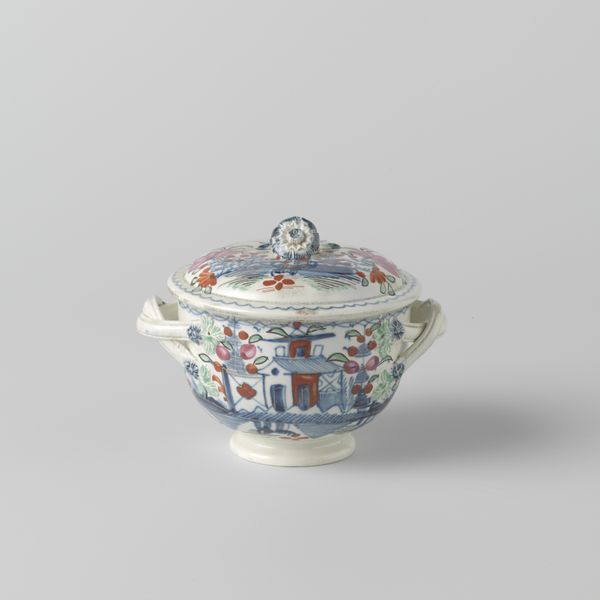 Editor: This is a lovely little thing, isn't it? A "suikerpot," or sugar pot, made around 1700-1730. It's earthenware, from the Dutch Golden Age, currently held at the Rijksmuseum. There’s a quiet beauty about its form and the delicate floral patterns. What really captures your imagination about it? Curator: Oh, it whispers of a slower time, doesn't it? I see stolen moments, the gentle clinking of spoons... the theatre of taste! The palette, for one thing, sings of necessity and artistry hand-in-hand: those copper oranges and cobalt blues – probably the most vibrant pigments available then. Does it make you think of anything? Editor: I suppose it reminds me of Delftware... is that connected? Curator: You've got it! It likely IS Delftware, or trying to be. The potters were often trying to mimic expensive porcelain. The glaze, the decoration, are all part of this story of trade, aspiration, and clever mimicry! Imagine the wealthy families using it! Editor: So, it’s like a decorative, accessible version of something even fancier? Curator: Precisely. But don’t underestimate it. See those little imperfections in the painting? Each one is a testament to a human touch, to a life lived creating beauty despite limitations. Editor: I see what you mean! It’s more than just a pretty pot, it's a little time capsule. Curator: Exactly! Next time you stir sugar into your tea, remember this little pot and the quiet revolutions brewing within its elegant form. Editor: A perfect snapshot of history contained in ceramic. Thanks for illuminating it for me!
