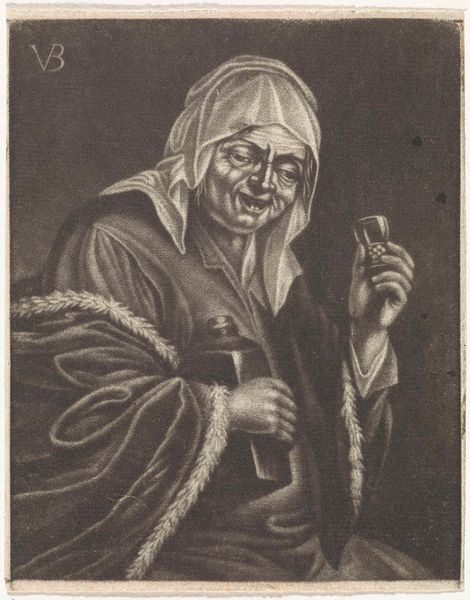 This is "Zingende oude vrouw" by Johannes de (II) Groot, etched some time in the 18th century. The composition is dominated by the figure of an old woman, her form emerging from a chiaroscuro of shadow and light. The texture of the etching brings a tactile quality to the scene. The artist uses line and shadow to convey the woman’s aged features and the folds of her dark cloak, creating a striking contrast that draws our eye to her expressive face. The strong tonal contrasts are indicative of the Baroque aesthetic, and the artist's commitment to dramatic visual effects. The woman, in her act of singing or chanting, is deeply immersed in her own world. The etching process renders the scene with a stark simplicity, stripping away excess detail to focus on the human form and its emotional expression. The visual elements of the artwork, while rooted in the techniques of its time, invite us to consider how the interplay of light and shadow can reveal deeper truths about human existence. It is in this dynamic between form and content that the artwork finds its enduring relevance.
