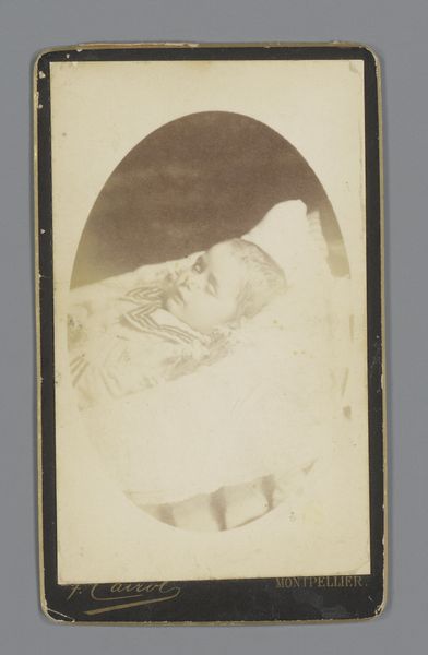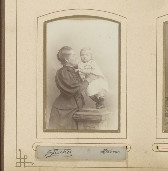 Curator: Here we have a gelatin-silver print, dating from 1868 to 1917, titled "Fotoreproductie van een geschilderd portret van een moeder met baby", attributed to M.M. Couvée. The piece currently resides here at the Rijksmuseum. Editor: It has such a delicate feel to it. Almost like a faded dream of motherhood. The soft focus contributes to this impression. Curator: Yes, it evokes a Romantic sensibility. Interestingly, this isn’t just a photograph; it’s a photo reproduction of a painted portrait, so it's already mediated. That places the artwork in a complicated relationship with authenticity. Editor: I immediately start to consider how this mediates societal expectations of motherhood. The almost ethereal presentation aligns with historical idealizations of women as nurturers, existing in this private, almost otherworldly sphere. Curator: The photograph seems to be mounted within a larger album page; one wonders about its intended audience and purpose within that domestic context. Was this a private memento, intended for family? How did the emerging culture of photography affect the public's perception and access to portraiture? Editor: It also makes me consider accessibility. This photograph offered a somewhat more accessible mode of memorializing family, expanding visual representation of sentimental ideas to broader audiences but arguably still situated within a privileged segment of society. The softness could even signal the idealized role ascribed to women during this era. Curator: Precisely, and in studying the materials themselves—the gelatin silver print, the presumed original painting—we are able to investigate the broader commercial art networks that proliferated at the time. The art historical context gives way to the societal position afforded women and its propagation by artwork like this. Editor: A fascinating point. Thinking about the original painting’s audience, coupled with the accessibility of the reproduction, it becomes a layered statement about representation, class, and the projected image of women and motherhood in the late 19th and early 20th centuries. It opens so many doors, doesn’t it? Curator: Indeed, each layer reveals deeper insights into the social and visual culture of the era. Editor: I am now reflecting on my initial feelings as to how such images reinforce limited, even damaging perspectives about gender, work, and womanhood that need constant revision.