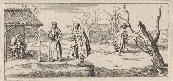 Editor: Here we have an untitled pen and ink drawing from the British School. It's quite small, just 33 by 72 millimeters, depicting two figures on a journey. The mood feels somber, almost burdened. What do you see in this piece from a historical perspective? Curator: It evokes the socio-political turmoil and displacement common throughout British history. The etching technique, while simple, speaks volumes about accessibility and dissemination of imagery. Who were these images for, and what narratives did they reinforce about poverty, war, and societal roles? Editor: That's fascinating. I hadn't considered the social impact of the artistic medium itself. Curator: Exactly. The drawing’s power lies in its ability to represent not just individuals, but the larger forces shaping their lives. It makes you wonder about the artist's motivations. Editor: I agree. Looking at it now, it makes me think more deeply about the relationship between art and social commentary. Curator: It is a starting point for understanding the public role of art.