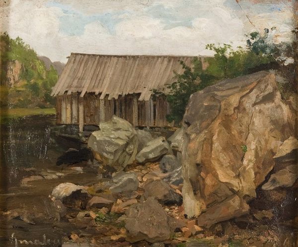 Curator: This is John Constable’s "The Old Mill Shed, Dedham", painted in oils. A fascinating slice of rural life, but the date of creation is currently unknown. Editor: The scene immediately evokes a sense of time and decay, doesn’t it? That collapsing structure, the textures of wood and thatch, all painted with a muted, almost somber palette. It hints at transience, the inevitable wearing down of things. Curator: Indeed. Constable often returned to familiar locales like Dedham Vale, documenting these landscapes with meticulous observation, although the specific sociopolitical narrative might be less explicit than some of his contemporaries. It’s tempting to look at how sites like this functioned, though; the Mill’s importance in the social life of Dedham for work. Editor: Absolutely. The very image of a mill, in folklore, often represents industriousness and abundance. And that shed, the man, feels more than symbolic, too: look through that doorway. Does he represent hard toil and human reliance on nature’s offerings. I see the eternal, honest cycle of things, as evidenced in material symbolism, and the figure quietly bowed. Curator: The man's labor in the context of a declining structure is especially striking. You have this interplay between nature and industrial progression during a time when England was transforming rapidly; this could function, symbolically, as lament toward modernity in Britain.. Constable was navigating that space, representing rural England. He himself benefited greatly as he moved into the city, selling these bucolic snapshots to London buyers. Editor: Interesting point. To see this art from the city with its eyes set on what is considered pastoral is the appeal of the picturesque; as in "charmingly or quaintly attractive". Curator: These works became powerful, though. Constable brought attention and value to these environments, and prompted a national reflection on the human relationship with landscape and labor. Editor: I will certainly consider the piece as an allegory of hard labor but the charm and appeal it has of a picture from long-ago. It has a magnetic pull into that vision, Constable provides for viewers and his audience. Curator: Seeing the social context, I might suggest it offered more complex commentary on these changes in 19th-century England, its culture, its past and future Editor: The symbols of labor and decay combined speak on levels. A fascinating window onto a specific place and, in so doing, into enduring aspects of the human experience.