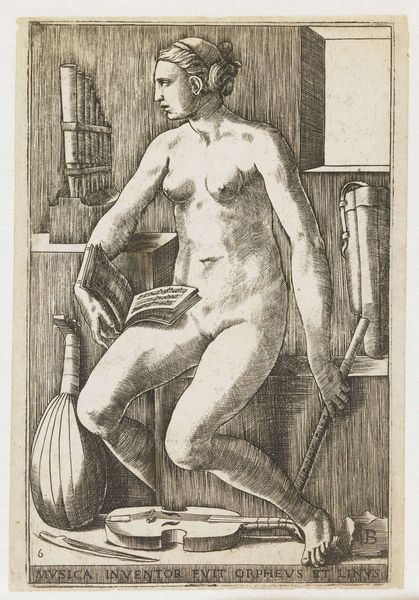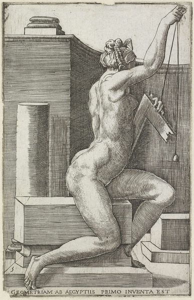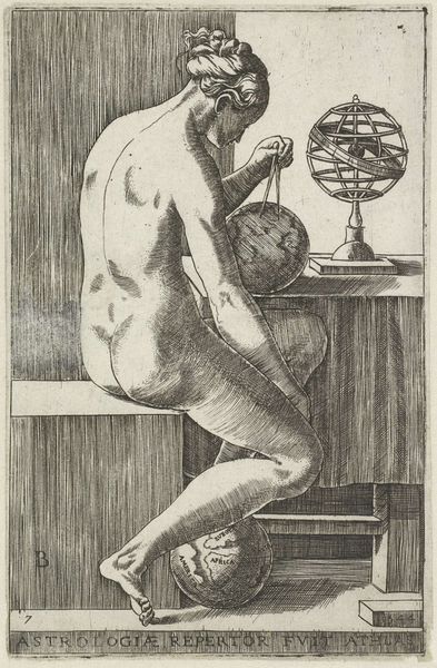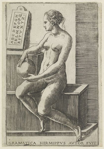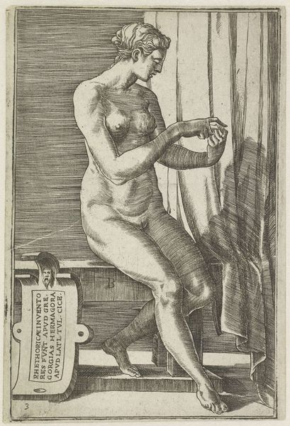 Giulio Bonasone created this engraving titled "Dialectica" in the 16th century. It is a depiction of Dialectic, the art of investigating or discussing the truth of opinions. The female figure embodies the discipline of logic and reason as she is commonly portrayed as a woman during the Renaissance, reflecting the era's evolving but still gendered understanding of knowledge. Note how she is seated amongst cubic forms, perhaps alluding to the foundational structures upon which logical arguments are built. She holds scales, visually representing balance and judgement. The nudity of the figure invites you to consider the intersections of classical ideals and the male gaze during the Renaissance. The artwork encourages us to contemplate the role of women in intellectual pursuits and the complex interplay between objectification and empowerment within historical representations.