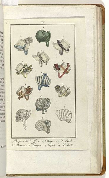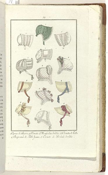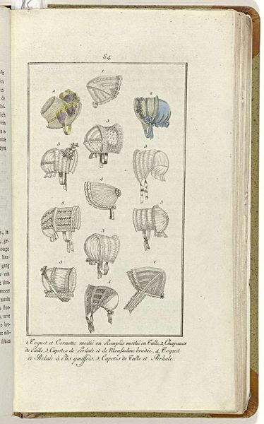 This page from Elegantia, a journal from May 1808, features delicate etchings detailing women’s bonnets. The layout arranges these bonnets in a structured yet playful grid. The anonymous artist uses line and subtle washes of color to define each bonnet's form, highlighting the varied textures of lace, ribbon, and fabric. Notice how each bonnet, though similar in function, presents a unique architectural design. This visual emphasis on form over strict representation hints at broader cultural concerns. Fashion here functions as a language. Each bonnet is a signifier of social identity and personal taste. It challenges fixed notions of femininity by presenting a range of aesthetic choices. The artist doesn't merely depict fashion. They dissect it, inviting us to decode the complex interplay of social meanings woven into each delicate fold and ribbon. This attention to detail elevates the everyday, transforming a simple fashion plate into a study of cultural codes and individual expression.