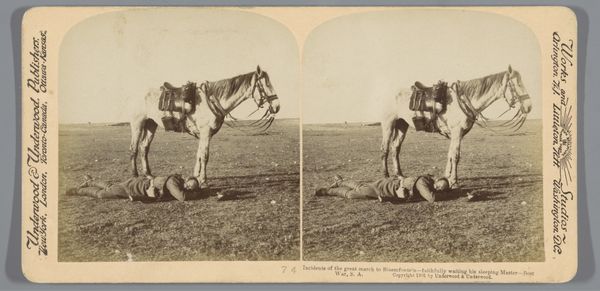 Editor: This albumen print, titled "Voorstelling van een man naast zijn gestorven paard tijdens de grote reis naar Bloemfontein" and created around 1901, has such a desolate and affecting mood. The stark landscape emphasizes the loss of the horse. I'm curious, what resonates with you most when you look at this piece? Curator: Well, immediately, I see a pointed commentary on the Anglo-Boer War being waged at the turn of the century. The photograph’s matter-of-fact presentation of death, set against the vast emptiness, is precisely the kind of image that found its way into the stereoscopes of middle-class homes. We need to think about its purpose. Was this an objective record, a means of shaping public opinion about the war, or something else entirely? Editor: Shaping public opinion? So, this isn't necessarily about commemorating the horse? Curator: Precisely! Think about who commissioned and distributed such images. Underwood & Underwood were a major player. They weren't simply documenting; they were selling a narrative. This image participates in the larger socio-political theatre of war, attempting to evoke certain responses, whether it be sympathy for the soldier, acceptance of the cost of war, or perhaps even justification for British actions. How do you see the setting functioning here? Editor: The landscape does seem deliberately bleak. Almost theatrical in its emptiness, directing attention solely to the man and his loss. Knowing its potential for propaganda shifts how I understand the emotional weight. Curator: Exactly. It highlights the political context in which art, even photojournalism, is created and consumed. Understanding that shifts our perception. Editor: I never considered how this intimate, tragic scene could also serve a larger, perhaps more manipulative, political function. Thanks! Curator: And I learned that viewing it solely as propaganda is too simple; perhaps this touched on the real costs for soldiers from afar. A useful discussion!