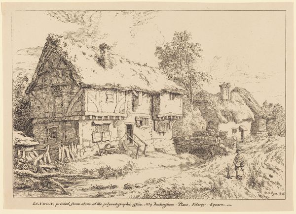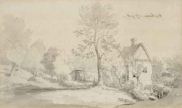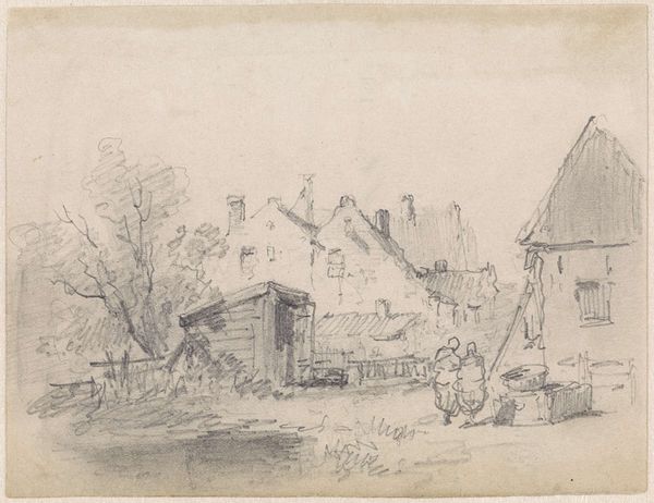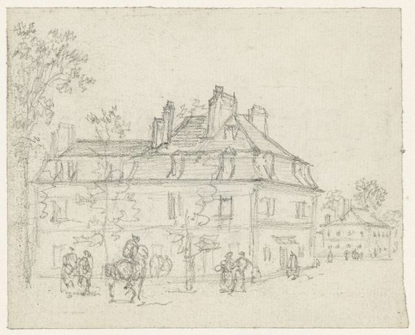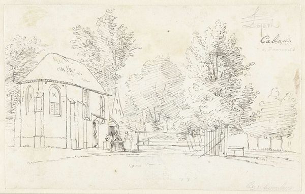 Curator: Here we have Cornelis Pronk’s “Schiebroek,” a pen and ink drawing dating from sometime between 1720 and 1740. It’s currently held here at the Rijksmuseum. Editor: My first impression is one of airy lightness. The scene seems sparsely populated, the pen strokes delicate. There's a kind of calmness in the geometric ordering, but I’m also interested in how such a quiet scene might challenge preconceived notions of 18th-century Dutch life. Curator: Well, given Pronk’s position, let's dig into who might be in a position to be looking at such views. While ostensibly a simple landscape, remember that Pronk occupied a significant role in the Dutch East India Company. The work captures a specific geographic location in relation to the burgeoning wealth being extracted and accumulated during this period in the Netherlands. How might such a landscape play into colonial agendas? Editor: That's fascinating, considering the seemingly unadorned nature of the piece. Looking purely at its compositional elements, I’m struck by how the artist uses line weight to create depth. Notice how the buildings on the left are rendered with more confident strokes than the trees in the background, giving them an ethereal quality. I'm further intrigued by the placement of the buildings themselves and how Pronk manages to flatten and emphasize space—it feels slightly distorted but ordered. Curator: Precisely! This selective use of line, combined with his position within a larger colonial framework, underscores the idea of what’s rendered as central to life versus the obscured "periphery". It can even reflect Dutch society’s perceptions of different social groups. Who inhabits those buildings and who is afforded the privilege of leisurely observing? Editor: Your reading introduces fascinating levels of interpretation. Now when I look at the carriage, it suggests wealth but also a certain detachment, a viewing from a removed, mobile perspective. Curator: Exactly! So next time you think of a seemingly bucolic landscape, ask yourself who has access to that pastoral ideal and what sociopolitical undercurrents lie beneath its serene facade. Editor: And I think that's a call for us to always carefully parse the lines, compositions, and techniques in art, for it always reveals so much more than what’s immediately apparent.