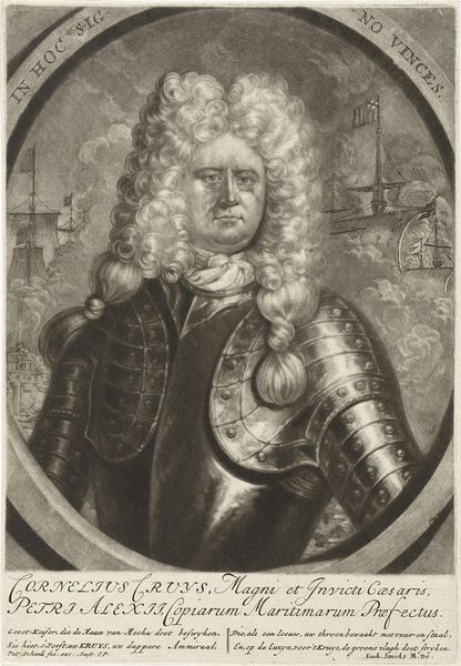 Editor: Here we have Adriaen van der Werff's oil painting, "Portrait of Lieutenant-General Godard van Reede, Lord of Amerongen," made sometime between 1690 and 1703. He looks…impressive, formidable even. It’s the armour, perhaps? What else do you see in this piece? Curator: I see a carefully constructed image intended to project power and legitimacy during a period of significant political and social change. Consider the context: this is a Dutch nobleman, likely painted during or shortly after the Williamite War in Ireland. How do you think the political climate might have influenced this portrait's reception? Editor: So, this wasn't just about capturing his likeness but also about making a statement? Curator: Precisely! The choice of armour, the carefully arranged drapery, even the landscape in the background—these are all visual cues designed to communicate status and authority. Think about the role of patronage here. Van Reede, by commissioning this portrait, is actively participating in the construction of his own historical narrative. It also subtly reminds the viewer of Dutch military prowess. Editor: It’s interesting how the portrait almost becomes a form of propaganda. But is that typical for portraits from this era? Curator: Certainly, portraiture in this period often served a propagandistic function, particularly for individuals involved in politics or the military. Artists were keenly aware of their role in shaping public perception and worked closely with their patrons to craft images that conveyed specific messages. The Rijksmuseum’s acquisition and display of such works contribute to our understanding of the complex interplay between art, power, and history. Editor: I had never thought about a portrait being part of some active dialogue that engages in broader cultural discourse. Curator: Indeed. By looking closely, we can unlock layers of meaning related to societal values, political power, and individual identity in the late 17th and early 18th centuries. Editor: Well, this has totally changed the way I will approach art and how it represents the subject in that specific moment of history. Thank you!