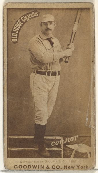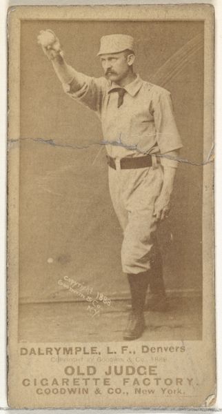Curator: Goodwin & Company's "Edward M. Daily, Pitcher, Washington Nationals," from 1887, offers a glimpse into early baseball portraiture. This albumen print, originally a promotional card for Old Judge Cigarettes, captures Daily in a poised, though somewhat enigmatic, pose. Editor: There's something very appealing about its tonal uniformity. The sepia wash feels almost timeless, lending a soft focus even to the figure's face. It evokes a sense of quiet contemplation more than athletic prowess. Curator: Precisely. The print's function speaks volumes about the burgeoning commercialization of sports. Here we see photography intersecting with mass advertising, a symbiotic relationship that shaped the modern celebrity athlete. Goodwin & Company cleverly capitalized on baseball's popularity. Editor: I agree. Visually, it’s interesting how Daily's pose defies expectation. He isn't in mid-pitch; instead, his hands are clasped near his face in a rather introverted gesture. This breaks the typical heroic mold seen in sporting depictions, doesn't it? It creates a sense of the man beyond the player. Curator: Absolutely. His gesture introduces an element of vulnerability or even anxiety. It moves beyond the superficial image of sporting confidence. Furthermore, consider how the cigarette company uses his image to enhance their own product’s appeal within a growing market. Editor: Indeed, a kind of calculated intimacy. The Old Judge brand name stamped so clearly links the athletic image with consumption, reflecting cultural values where virility is carefully packaged. But let's also consider that uniform, that thin pinstripe almost bleeding into the photograph, that tiny striped cap atop his head—it feels fragile. Curator: It points to the evolution of sports and their iconic imagery within an evolving social context. Examining such an artifact sheds light on not just Daily, but the wider landscape of America's pastime. Editor: Looking at the artwork today, I find the simple composition, bathed in that nostalgic tone, offers a compelling contrast to today's slick and stylized marketing. Curator: The convergence of visual and cultural data points that enrich this otherwise unassuming photographic print.