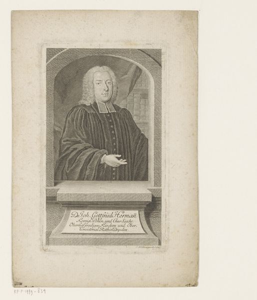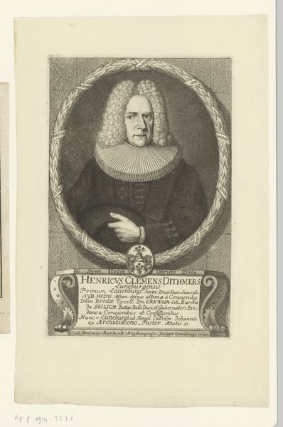 This is Johann August Corvinus’s 1707 engraving, "Portret van Johannes Tulla op 45-jarige leeftijd," made with burin and etching. The composition balances a tightly rendered portrait with symbolic textual elements, all contained within a small rectangular space. The oval portrait frame, circumscribed with text, focuses our gaze on Tulla, whose face is meticulously detailed through hatching and cross-hatching. The ruff collar, a series of concentric semi-circles, draws attention to the face through stark contrast. Below, a rectangular block displays a poem, framed by an emblem, adding another layer of semiotic complexity. The text, both as content and form, serves as a commentary on Tulla’s virtues and his relationship with the divine, reflecting broader cultural values. Corvinus’s skilled use of line and space transforms a simple portrait into a meditation on identity, virtue, and spiritual devotion. The visual structure directs us through a series of signs, each contributing to a larger cultural and philosophical narrative.