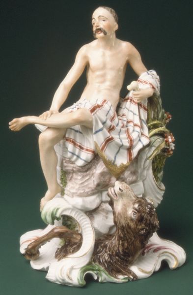 Curator: Ah, this piece has such character! It’s “Guitarist,” made between 1750 and 1764 by the Capodimonte Porcelain Manufactory. It's a delightful porcelain sculpture, full of Rococo charm. Editor: My initial thought is, pure joy. The way he’s belting out that tune, throwing his whole body into it! It’s incredibly lively for a piece of porcelain, isn’t it? Curator: Absolutely. These Capodimonte figures were incredibly popular. This one embodies a sort of pastoral fantasy. A glimpse of a carefree, idealized life. But porcelain itself also carried considerable weight. Editor: Right, porcelain… often collected, isn't it? More than just decoration? This almost theatrical pose— arm upraised, mouth wide open—it’s like a captured moment from a play. I bet it would be a statement on any aristocrat's mantle! Curator: Exactly! These porcelains signified wealth, artistry, refinement, and worldliness. Capodimonte sought to impress and emulate fine art. They brought opera characters and musical figures into these elite collections, so music wasn't confined to concert halls. Editor: Thinking of its modern setting in the Met, surrounded by thousands of works of art with such weighty themes... this "Guitarist" shines like a happy interlude. Does it subvert this role somehow? Perhaps its very disposability provides an unassuming appeal and ironic commentary? Curator: That’s a brilliant perspective. Mass production did, over time, democratize porcelain. So its role shifted. It still is about elegance, but about something more humble, domestic. I find it touching. Editor: So, what starts as high art filters its way down to middle class, and by extension a wider viewership now? And you know what else strikes me now? Porcelain itself seems an unexpected choice for such a boisterous, loud figure. Like capturing thunder in a teacup. Curator: Ha! Exactly! That tension adds a whole layer of wit, doesn't it? Porcelain implies restraint; he embodies the opposite. I love that contrast. Editor: Me too. It makes me smile. The artistry is certainly charming, and in terms of artistry or history, that's not something you often hear anymore, is it? I'm glad to feel this simple sense of pleasure again, contemplating such fine pieces like this. Curator: It does give you the feeling you can almost hear that joyous tune! Thank you for opening a different window!
