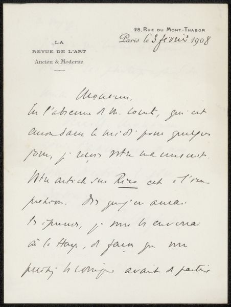 Editor: Here we have "Brief aan Philip Zilcken", possibly from 1907, by Jules Comte. It’s a drawing, ink on paper. I must admit, the handwritten text is giving me a bit of a romantic, old-world feel, even though I can't actually read French. The script seems to dance across the page, doesn't it? What strikes you most about this piece? Curator: Oh, you’ve hit on something crucial. This isn’t just information; it's almost like peering directly into the artist’s mind! Forget formal paintings; here we get immediacy, the quirky loops and jabs of the pen... Doesn't it make you wonder about Comte’s state of mind as he scratched out this letter? Was he impatient? Pensive? Imagine the ink drying as the words spilled onto the page! It makes the very act of communication so tactile. And, tell me, what do you make of the fact it is addressed to Philip Zilcken? Editor: Well, without knowing who Philip Zilcken is, it’s difficult. It is kind of cool seeing what must be a famous person's incoming mail. Was Zilcken perhaps another artist or a patron of the arts? The letterhead at the top says "La Revue de l'Art", so it seems to be tied to the art world somehow. Curator: Precisely! Zilcken was an artist and art critic – a major figure at the time. And seeing his name here brings to mind so many artists exchanging letters; their own private art form and running commentary on the art world. A bit of gossip mixed with profound thinking. This letter feels less like a simple message, more like a tiny performance between friends, even if it is asking for an appointment to chat a bit. Editor: That’s a beautiful way to put it! I definitely see it differently now—more of a snapshot of a relationship. Thanks! Curator: My pleasure. It’s wonderful how one little letter can open up so many avenues of thought, isn't it? A small window into a world.