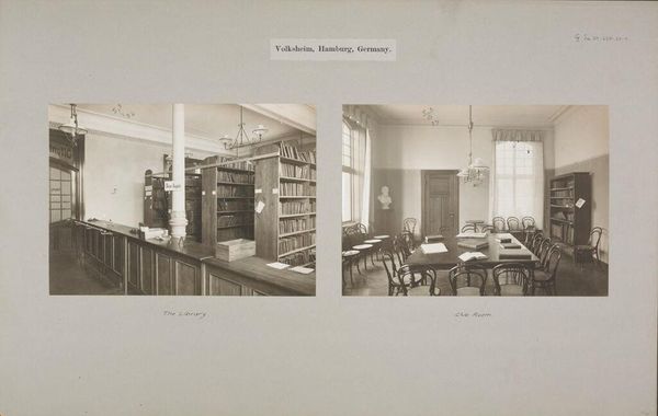 Curator: Here we have a photograph titled "Social Settlements: Germany. Hamburg. Volksheim: Volksheim, Hamburg, Germany.: The Library" by G. Koppmann & Co., the dimensions are 16.2 x 22.5 cm. Editor: The sepia tones lend a contemplative air; it feels like stepping back into a hushed, almost monastic space devoted to learning. Curator: Indeed. The photograph invites us to consider the symbolism of the library as a repository of collective knowledge and cultural memory, especially within the context of social settlements aimed at community enrichment. Editor: Notice how the vertical lines of the bookshelves create a grid-like structure, emphasizing order and rationality. Even the lighting, diffused and even, contributes to this sense of calm and intellectual purpose. Curator: It's fascinating to consider how spaces such as this one contribute to the collective psychological landscape of a community, fostering a sense of shared identity and intellectual aspiration. Editor: Ultimately, the composition invites us to reflect on the power of designed spaces to shape individual and collective consciousness. Curator: A striking image that resonates with the enduring human quest for knowledge.