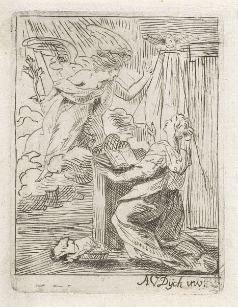 This print, “Man aan de hand van een engel,” was made in the Netherlands. The artist used the etching process: a metal plate covered in wax would have been drawn into with a sharp needle. Then, when the plate was bathed in acid, the drawn lines would bite into the metal. The real labor began after this when the plate was inked, wiped, and then pressed against paper to make an impression. You can really see the care taken here: notice the variety of line weights, creating a dynamic sense of light and shadow. The fine details of the figures contrast with the more abstract background. Prints like these were luxury goods, but also relatively affordable, making art accessible to a wider audience. Etching wasn't just a reproductive technique, but a creative act, a way to share ideas and stories, and even challenge the established order of painting. Appreciating the labor and materials behind this image helps us see it in a new light, as both a work of art and a product of its time.