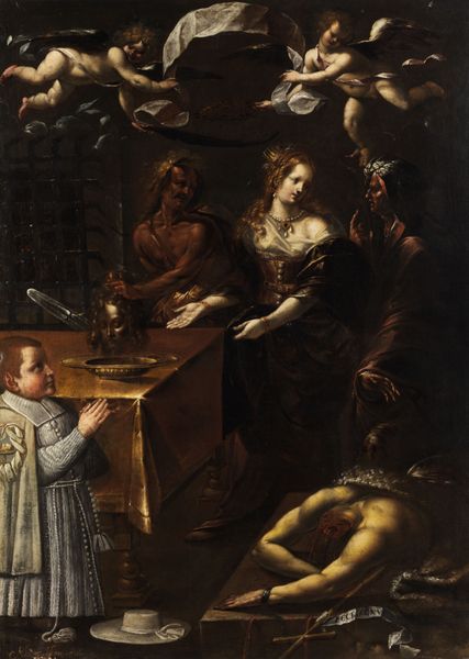 Editor: This is Salomon Koninck’s "Esther reading Haman's Decree of the Extermination of the Jews," from the 1630s, an oil on wood panel. It's quite dark, but the textures of the fabrics seem really opulent. What do you see in this piece beyond the immediate narrative? Curator: I see a powerful representation of vulnerability and resistance within patriarchal structures. The darkness isn't just a stylistic choice; it reflects the precariousness of Esther’s position, and, indeed, of the Jewish people in exile. Notice the older woman behind Esther, perhaps a servant. How does her presence affect your reading of the scene? Editor: It makes me think of support systems, but also of the social hierarchies at play. She’s physically present but positioned as a secondary figure. Curator: Precisely. Consider how Koninck is staging the drama here. Esther holds the decree—the instrument of potential genocide—but her power is contingent on navigating the male-dominated court. This painting becomes a potent symbol of how marginalized groups must often operate within and against systems of oppression. Do you see any resonances with contemporary issues of social justice? Editor: Definitely. The idea of reading—interpreting texts of power, and then strategically responding to them—feels relevant to many ongoing struggles against discrimination. It's interesting to think of Esther as actively resisting, not just passively accepting her fate. Curator: Exactly. The painting, then, is not just a historical depiction, but a meditation on the strategies of resistance, on using knowledge and influence to challenge oppressive systems. This work reflects both historical concerns, and timeless human responses to the precarity of identity and survival. Editor: This really encourages you to think beyond the surface and the immediate story of the artwork. Curator: That’s right, to view the past through the lens of contemporary concerns. The layers of interpretation really bring Esther's story alive.
