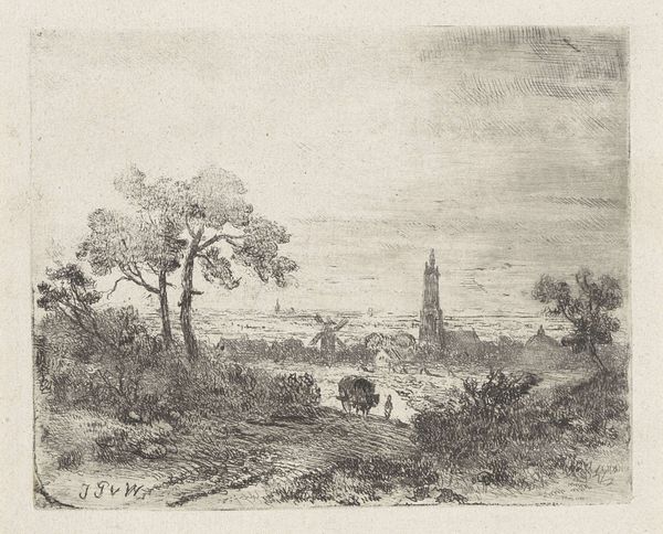 This is a print by Johannes Pieter van Wisselingh, a view of Rhenen, made using etching, an indirect intaglio process. The artwork is made by covering a metal plate with a waxy, acid-resistant ground. The artist then scratches into this ground with a pointed tool, exposing the metal beneath. The plate is immersed in acid, which bites into the exposed lines, creating the image. The appeal of etching lies in its relative ease compared to engraving. It allowed artists to achieve a wide tonal range and fine detail through the manipulation of line and texture. Here we can see the skilled labor of the artist in the details of the figures. Each element in the image relies on the etcher’s mark; even the sky is subtly worked, giving the whole scene a hazy atmosphere. In this artwork, the printmaking process is front and center, reminding us of the labor and skill involved in its creation.