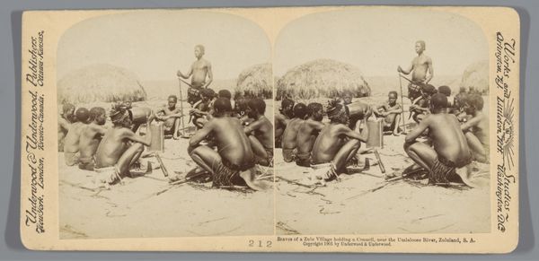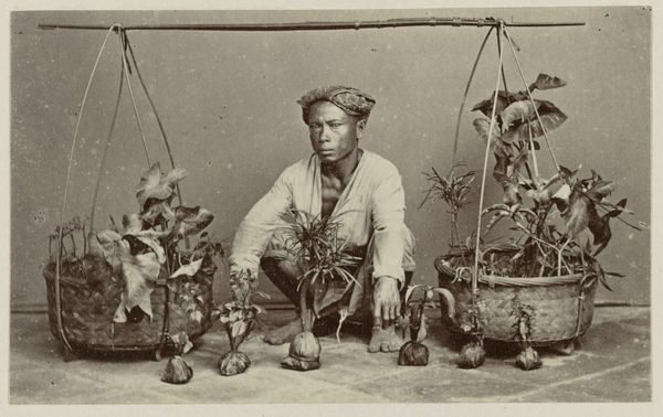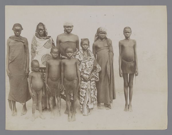 Curator: Willoughby Wallace Hooper created this albumen print, currently titled "Untitled (musicians)," sometime in the late 19th century. Editor: It feels staged, yet something about the starkness also feels deeply intimate, almost like catching a fleeting moment. Curator: Hooper worked extensively in India, documenting aspects of colonial life and local populations. The materiality of photography itself, the silver and paper, carried specific social weight in this context. Editor: There is a stillness in their eyes, a world of stories untold. I wonder what their music sounded like, the rhythms and melodies now lost. Curator: The image quality reveals the process, the inherent limitations of the medium forcing certain choices in composition and presentation of labor and leisure. Editor: It's a portal, a glimpse into another time, where the human spirit echoes through the crackle of an aged photograph. The silence sings. Curator: Indeed, the layers of production and the act of documenting offer a revealing insight into this historical period. Editor: This small window of observation holds a universe of possibilities. It will stay with me for a long time.