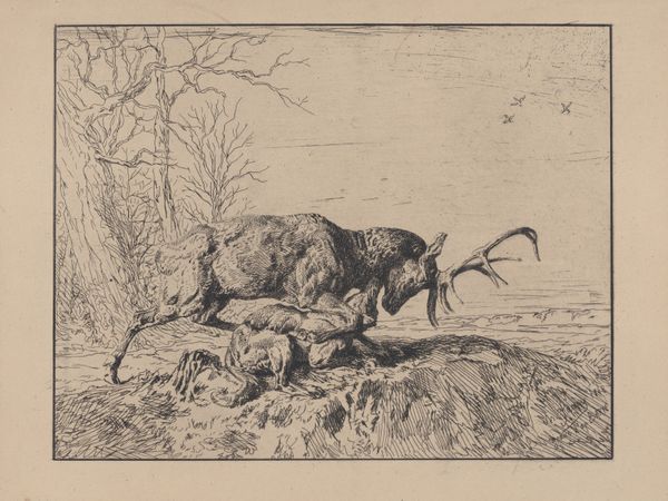Curator: At first glance, I find it both unsettling and captivating, a wild chase frozen in time. Editor: Indeed. Let's consider "Wild Boar, from \"Eaux-Fortes Animaux & Paysages,\"" a print by Karl Bodmer dating between 1855 and 1865. It is an etching; it captures a pair of boars charging through what looks like very dense forest undergrowth. Currently it resides at the Metropolitan Museum of Art. Curator: Charging is the perfect word! There's such an urgent feeling—are they fleeing, attacking, or just… living? It’s so primal. The landscape seems to swirl around them, chaotic, echoing their energy. Editor: Bodmer masterfully employs the etching technique to create depth and texture. Look at the lines describing the boars, particularly the shading giving volume and definition, versus the intricacy of the surrounding forest rendered with light and shadow—very different textures, all contributing to the dramatic effect of animals breaking through the landscape. Curator: It feels immersive. You can almost hear the crackling twigs and the boars’ heavy breathing. And their eyes...there is something intense behind them! They carry a fierce and urgent spirit. Editor: The composition emphasizes this urgency by positioning the boars slightly off-center and angled as if cutting diagonally across our visual plane. This directs our eye and communicates force. The monochromatic palette enhances the effect by giving everything starkness. Curator: I can only imagine wandering those ancient forests feeling watched, or even chased. Editor: What the artwork leaves me to think about is, even within a relatively constrained formal register—that is, printmaking—and the monochromatic nature of etching, there is huge emotional depth. Curator: Absolutely, I feel it too, this little window lets you see and feel such primal experience with clarity. It will stay with me.