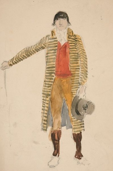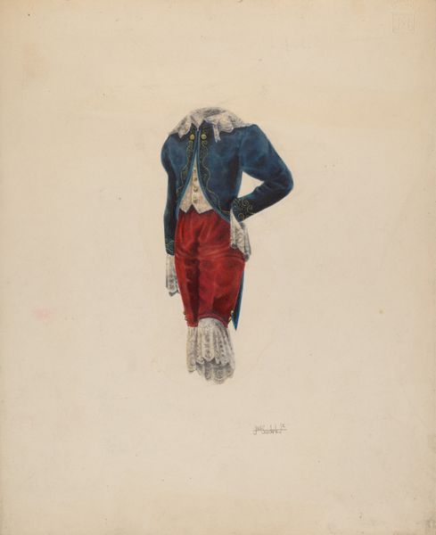 Curator: Good day, and welcome. Before us, we have Jane Iverson's watercolor and ink drawing, "Knitted Doll," created between 1935 and 1942. Editor: Well, that's a curious-looking doll. It’s… stout! The stark profile and color choices make it look somewhat melancholy, almost frozen in time. Curator: Absolutely. What's interesting is Iverson’s choice of rendering. Look at the figure’s clothing; notice the subtle ways she delineates textures through layering. This almost obsessive recording suggests this might have been related to studies of occupational materials—knitting and associated craft production during a particularly complex economic period. Editor: I do see that interesting texture in the sweater. But doesn’t the application of color lack volume? Note how Iverson creates these flat planes of grey for the pants and stark areas of shadow, failing to conform to the figure. Curator: I think that flatness points us to the formal tradition of folk art. While the illusionism isn't fully embraced, what matters is that the materiality and associated labor of such crafting are celebrated. Editor: You might be right. What stands out for me are the red highlights – the shoes and the edges of the red top really emphasize the boundaries of this oddly-shaped figure. Those strategic color placements give the doll a certain structure. Curator: Indeed, and it highlights how materials were available during that time and maybe the limits. Were specific dyes hard to source, pushing the aesthetic towards simple palettes? Or was that just her stylistic approach to the art? Editor: A fair question. I suppose what I value about this piece is how the formal elements underscore this doll's very stillness and introspection. Curator: And to me, it reveals the stories embedded in the everyday crafts and material lives of the working class during that era, captured through Iverson's observational hand. Thank you for that sharp insight, as always.