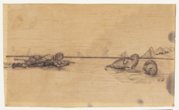 Curator: There's such immediate drama in this pencil drawing from Kaarale Andreassen. He created this narrative scene between 1927 and 1928, and it's currently held at the SMK, Statens Museum for Kunst. It is titled "Motiv fra et østgrønlandsk sagn (En fanger i kajak kæntres af kæmpesæl, tupilak)." That's "Scene from an East Greenlandic Legend (A hunter in a kayak capsized by a giant seal, tupilak)." Editor: It strikes me as ominous, despite its modest scale and earth-toned palette. The hunter's face is full of terror, and this creature emerging from the depths… it’s far from benign. I’d even venture to say it is something truly sinister here. Curator: Exactly. Andreassen, an Indigenous artist, tapped into deep-seated fears present in Greenlandic folklore. Seals are usually vital resources. Here, though, this one represents a "tupilak" – an avenging monster, animated through dark magic. Editor: The very act of creating a tupilak, imbuing it with malicious intent, becomes a form of resistance itself, a response to the injustices and intrusions of colonial forces on Greenlandic society and its spiritual beliefs. Curator: I read the kayak almost like a cradle being upended by a vengeful spirit rising from the subconscious. The artist captured the Inuit belief that violating the natural world invites retaliation. Notice how even the landscape behind seems to hold its breath, becoming witness and judge. Editor: Yes, a disruption of the balance. And what does it say that the hunter seems momentarily frozen? Unable to act against what rises before him? Perhaps a reflection of helplessness against overpowering forces? Curator: The drawing seems to illustrate a warning, a threat of disrupted cycles. Even though subtle in execution, its cultural symbolism speaks volumes. Editor: A crucial reminder of the power dynamics inherent in cultural narratives, this work connects the individual struggle of a hunter with larger themes of environmental and spiritual reckoning. A disquieting encounter, made vivid.