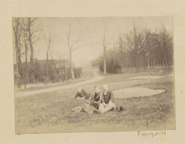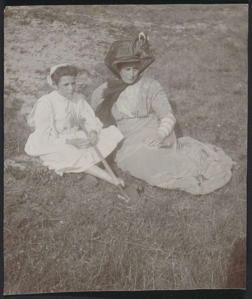 Curator: Oh, look at this Geldoff Adriaan Kessler photograph. "Two Costumed People During a Performance," it's called. From 1913, held here at the Rijksmuseum. What's your first reaction? Editor: It’s... melancholic. Like a play fading into memory. The stark contrasts feel heavy, almost Victorian. And those costumes—stiff and slightly out of place in such a natural setting. Curator: Exactly! The romanticism clashing with something unsettling. I feel a longing for simpler times, but something's slightly…off. Perhaps it’s the nature of performance itself, highlighting artifice within a seemingly natural romantic landscape. The artist may have been pondering these anxieties and contradictions. Editor: I'm wondering about the construction of the image, though. Photography in 1913 was hardly point-and-shoot. Who made those costumes, what kind of material did they use? I’m betting they were repurposing fabrics already available and cleverly constructing illusions for the photograph itself. I mean look closely, those details aren’t exactly pristine. Curator: Interesting point! It does seem they wanted to evoke an ideal, but the reality peeks through. And notice how the backdrop almost overwhelms them. The deep forest makes the performers small and fleeting. Editor: Which goes back to the labor. Think about the models posing for these shots too, often friends or family or locals being roped into participating. Their social dynamics, the economic exchange… It all adds layers of complexity to what seems like a simple, romantic genre scene. The trees themselves likely provided materials to craft the very costumes they’re donning, closing the circuit from earth to representation and back again. Curator: So, the image isn't just a pretty scene, but a window into the complexities of representation, performance, and social conditions of its time, right? Kessler invites us to question what we see... to examine not only the aesthetics but the hidden layers underneath. It feels like a subtle social commentary hidden within a sweet moment. Editor: Right. Beyond the "performance" on display, there’s the quiet story of what it took to *make* this image in the first place. All those unseen labors, all the material choices—those stories linger even a century later.