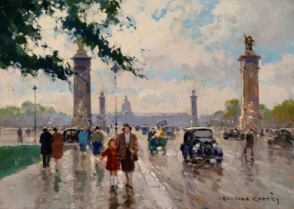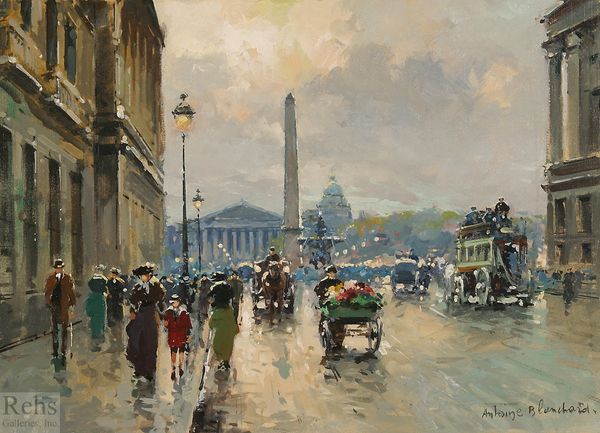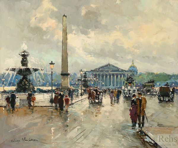 Curator: Antoine Blanchard’s “Place de la Concorde” captures a bustling Parisian scene. It offers a glimpse into city life through the artist’s modern impressionistic style. What are your initial thoughts? Editor: There’s a somber beauty to it, don't you think? The gray, muted tones almost conceal the life teeming within the square, dampening the vibrancy often associated with Parisian cityscapes. It really evokes a certain material reality. Curator: That's an interesting observation. Blanchard, while reminiscent of Impressionism, was indeed drawn to the ordinary. His depiction of urban life often involved capturing a specific class dimension; focusing here, perhaps, on the everyday encounters of Parisians amidst grand historical monuments and considering those intersections. Editor: Absolutely. And look at the brushstrokes. They’re thick and layered, which highlights the physicality of the paint and makes me think about the very labor involved in creating the piece. The blurred lines almost invite us to question the way urban progress obscures individual lived realities and historical traumas within urban environments. Curator: The placement of the Obelisk and the architecture in the background is interesting in how it centralizes imperial power structures in the middle of this scene. In my perspective, the painting can offer a commentary on power, public space, and how social experiences are always against the historical backdrop of the site. The "Place de la Concorde," given its history, cannot escape that weight. Editor: That's right! Plus, that layering effect creates almost a fog of historical perspective, as it gives the sense of people trudging through this very physical and also symbolic space in ways that cannot ever fully divorce the two. This way of using the materiality of the painting really reflects material conditions in the square itself. Curator: Overall, this invites us to look beyond the surface of a city scene, towards the histories, labor, and socio-political factors. It challenges our perspective of grand boulevards and monumental sites to also question our present role within that landscape. Editor: Definitely. I walk away seeing this work as a testament to the city's ability to be reshaped and reinterpreted through labor and social movements. It highlights, in pigment, the dynamic dance between matter, action, and place.