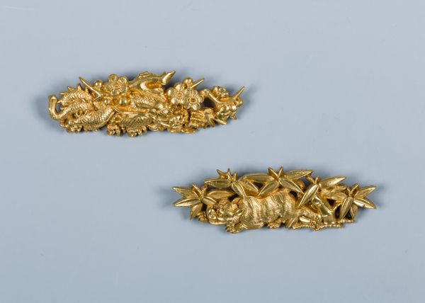 Editor: Here we have a pair of Sword-Grip Ornaments, or Menuki, created between 1650 and 1750 by Gotō Tsūjō. They are metal carvings intended to adorn a sword. I’m immediately struck by the level of detail despite their size. What do you make of them? Curator: Dragons! Always potent symbols, but consider *where* they are placed. These aren't monumental statues. They're intimate objects, meant to be held. Dragons, powerful bringers of storms and change, are being tamed, literally gripped in the hand. Editor: So, it’s about control? The warrior controlling this immense power? Curator: In a way, yes. But think too about the dragon itself. In Eastern art, they often represent wisdom, longevity, and prosperity alongside their fierce reputation. Having these figures close is an embrace of these qualities. It's a constant visual and tactile reminder of potential. How does the context of armor impact your understanding of these symbols? Editor: I guess it suggests preparation and protection…like they’re drawing strength from it, or maybe it serves as a warning. Curator: Precisely. Symbols speak in layers. These Menuki embody power, wisdom, and, fundamentally, the spirit the samurai aspires to cultivate, integrated directly into the tools of their trade. Editor: It’s fascinating how such small ornaments carry so much meaning, influencing the wielder's state of mind and projecting an image. Curator: The artist plays an interesting role – conveying cultural and personal meaning. It makes you wonder what other types of adornments, what images, affect us daily without our realizing it.
