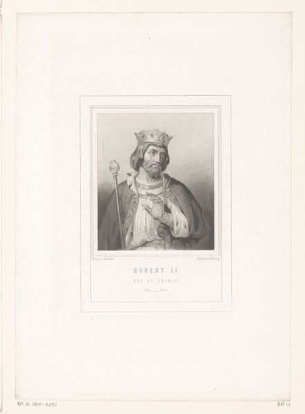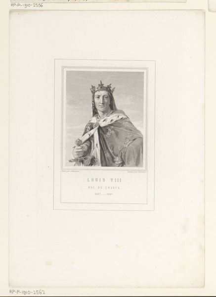 Editor: Here we have Antoine Jean Weber’s "Portret van Filips V, koning van Frankrijk", an engraving that seems to have been produced sometime between 1814 and 1875. The image of Philip V appears quite stoic and regal. Given that this is a later engraving of what I assume is an earlier painting or depiction of the king, what historical forces do you think might have been at play in shaping its production and reception? Curator: That’s a fantastic question! The creation of a portrait like this, especially as an engraving intended for wider circulation, speaks volumes about the role of imagery in constructing national identity. This print, created long after Philip V's reign, would have been influenced by evolving views of the monarchy. Ask yourself, why create this now, nearly a century after the King’s passing? Editor: Well, given its creation in the 19th century, could it be linked to the rise of nationalism and a desire to look back at idealized figures of leadership, almost to justify the current political landscape? Curator: Exactly! Engravings like this offered a relatively affordable way to disseminate historical narratives and visually connect the present with a carefully constructed past. Consider how the image of royalty—the crown, scepter, the hand-over-heart gesture of nobility—contributes to the aura of power and legitimacy. Was this perhaps for popular consumption in contrast to more scholarly, academic accounts of the period? Editor: So, the value lies not just in who Philip V was, but what the artist and distributors *wanted* him to represent to a 19th-century audience? It feels less about historical accuracy and more about political messaging, even propaganda. Curator: Precisely. It reflects the social and political function art can have, influencing public perception. I wonder how people received such imagery given social inequalities. Editor: This has certainly provided a valuable perspective, showing how even a seemingly straightforward portrait can be layered with meaning. I’ll definitely be considering the sociopolitical context more deeply in my future studies. Curator: It's fascinating how art functions as a cultural mirror, and analyzing art like this reminds us how intertwined history, politics, and imagery really are.