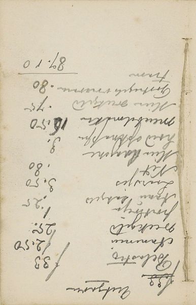 Willem Koekkoek made "Lijst met uitgaven" which translates to "List of expenses," with ink on paper. The page presents a stark contrast, with light paper starkly supporting dark ink markings. It is defined by lines of handwriting with numbers that cascade down the page, each entry a fragment of daily life. The visual impact here relies not on pictorial representation but on the structured arrangement of text. We observe here a tension between the orderly intention of accounting and the disorder of handwriting. Each letter, each number, becomes a signifier. The lack of traditional artistic elements invites a structuralist reading, where the list becomes a system of signs reflecting broader economic and social structures. Koekkoek's list destabilizes conventional notions of art, challenging viewers to find value and meaning in the mundane. In its raw form, the list is a direct, unmediated representation of its creator's world. The interplay between intention, documentation, and the aesthetic qualities of the handwritten form, invites ongoing interpretation.