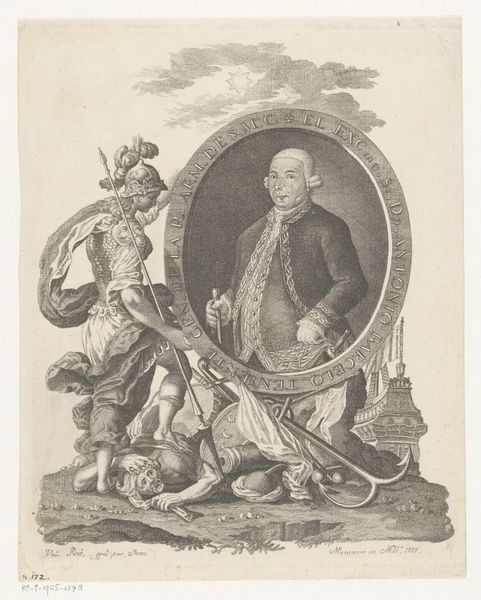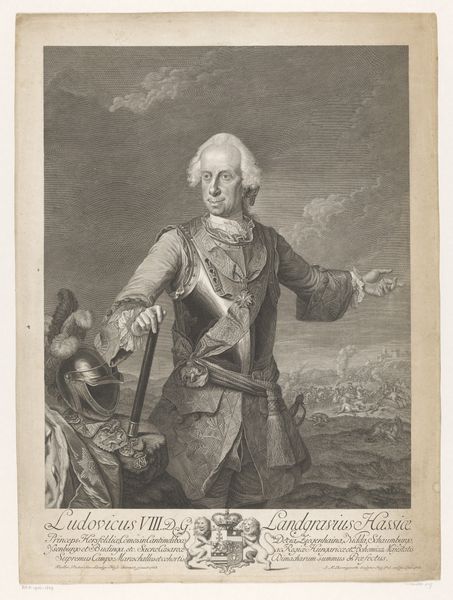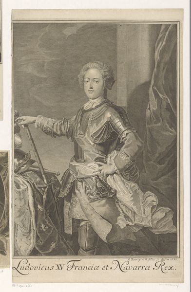Curator: Look at the incredible detail in this engraving, “Portret van Lodewijk XV” made by Nicolas de Larmessin in 1727. The precision work truly elevates what could have been just a royal portrait into a sophisticated representation of power and class. Editor: Immediately I’m struck by the contrast. A child king dressed for war and surrounded by symbols of wealth...the overtness makes me feel uneasy. What sort of childhood did Louis XV have? Curator: Considering that this is an engraving, a print pulled from an incised plate, the degree of detail suggests a labor-intensive process. Each line, meticulously carved, serves not only to create visual depth and texture, especially in rendering the fabrics and armor, but also symbolizes the immense power required to maintain an opulent kingdom. The labor literally manifests the crown's privilege. Editor: Exactly, and look at that cherub peeking out from behind the table! It is like the artist wanted to underline the manipulation inherent in such displays. Positioning the child king as a powerful figure involves obscuring, or at least aestheticizing, the more troubling aspects of ruling power at such a young age. Curator: It's a careful calculation of visual signifiers. The classical architectural backdrop, the ornate furniture, even the king's pose and expression…all manufactured to exude a particular image of stability and divine right, further entrenched in Academic art practices and Baroque sensibility. Editor: Yes, it brings into sharp relief how identity, particularly that of those in positions of authority, is carefully constructed, consumed, and distributed through images. A piece like this reveals the intersectional elements of monarchy: childhood, class, gender—and how those get wrapped up into legitimizing dynastic power. Curator: In some ways it serves almost as propaganda, shaping perceptions of royalty. The decision to use engraving also is very purposeful in terms of the democratization and wide dispersal of images, a contrast between fine art objects, mass production, and their consumption by various levels of society. Editor: A critical analysis reveals the inherent issues that arise when institutional powers are visualized through selective symbols, as we see here so artfully portrayed. It demands engagement from contemporary art historians who see themselves as integral agents in our historical record. Curator: I agree; by examining the mechanics of the artwork, we can understand how potent an art object can become. Editor: Absolutely, and hopefully we’re empowering listeners to critically look beyond what is on the surface.