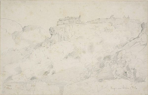 Curator: Here we have Joseph Mallord William Turner’s sketch titled, “Stirling Castle,” housed here at the Harvard Art Museums. Editor: The atmospheric perspective is subtle but striking. It almost feels like a memory fading into the paper. Curator: Indeed. Turner's use of light and shadow suggests a nuanced exploration of history and place. Considering the castle's role in Scottish history, there's a dialogue with power and identity. Editor: Absolutely. The ghostly castle looms over what appear to be trees, suggesting a kind of dominance, but is it celebratory or cautionary? Curator: Perhaps both. Turner was always interested in how architecture and landscape intersect, often to comment on social and political change. Editor: Well, it reminds me that grand architecture often comes at a human cost, a cost often erased from these idyllic landscape renderings. Curator: A fitting and crucial reminder, highlighting how the formal elements can indeed be imbued with historical context.