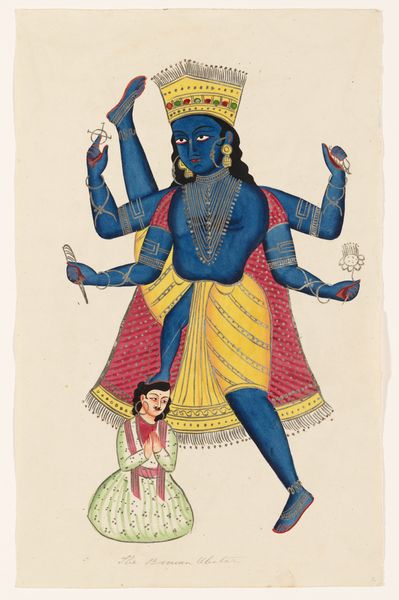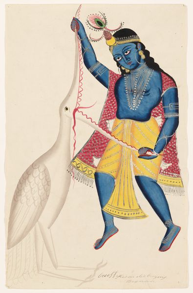Curator: What strikes me immediately is the almost childlike wonder in this piece. It’s got this folk-art vibe that’s incredibly disarming. Editor: This painting, entitled "Krishna and Balarama underneath a Tree," is believed to have been created around the 19th century, and you can currently find it at the Minneapolis Institute of Art. The artist remains anonymous, though clearly influenced by indigenous styles of the Americas. It presents the two figures, presumably the deities Krishna and Balarama, standing beneath a stylized tree. Curator: Stylized is putting it mildly! The tree looks like something from a dream, a vibrant canopy floating above them. And those figures...they've got this lovely stiffness, a certain formality that clashes amusingly with their playful poses. It's as if they're caught between divine duty and a bit of mischief. I mean, Krishna’s holding his flute, but his eyes, they look ready to wink. Editor: Indeed. The piece blends genre painting with elements of caricature, portraying a narrative with these recognizable figures rendered almost as folk heroes. The composition does lack traditional perspective. The figures are quite flat, emphasizing decorative patterns rather than realistic form. How does that flattening affect you? Curator: I think that adds to its charm. It's as if the artist is saying, "forget your earthly concerns, let's tell a story, simply, beautifully." There’s an accessibility here, an invitation to engage with the divine on a more human scale. Even the colour scheme; it pops. Is the colour considered traditional or does this deviate in some way? Editor: The vibrant colors are definitely within the tradition of Indian miniature painting, though the boldness and simplification perhaps hint at a regional variation or individual interpretation. We must acknowledge the power of color as a narrative device, heightening the otherworldly aspect of the story for a broader audience. I'm curious, does knowing it depicts Krishna and Balarama alter how you view the piece? Curator: Not really, I feel like the raw emotional energy transcends the specific religious context. It’s a celebration of something universal – brotherly love, the joy of simply existing under a tree on a sunny day. I respond to the underlying feeling more than the literal subject matter, maybe because it makes those old stories feel ever so current, and present, again. Editor: A fitting observation. This artwork operates on multiple levels, reflecting social history and spiritual symbolism, ultimately revealing that art's greatest power lies in its ability to resonate across time and belief systems. Curator: Yes, it certainly whispers its truths and does so quite beautifully.