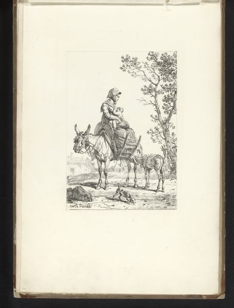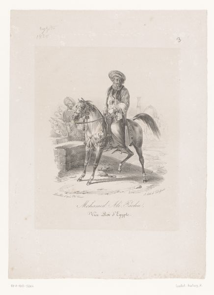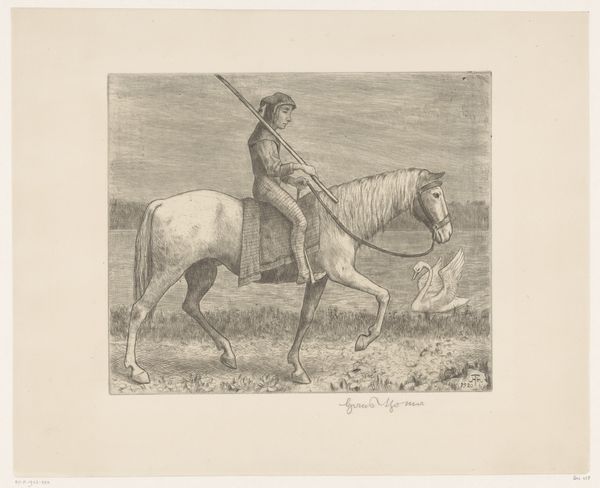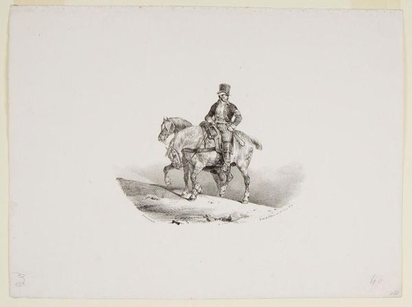 Editor: This is *Spaanse guerrilla strijder te paard* by Charles Beyer, created in 1819. It looks like a pencil sketch, quite simple but evocative. I am intrigued by the lightness of the lines. What do you see in this piece? Curator: Indeed, the deliberate arrangement of line and tone generates the work’s visual impact. Observe how the artist utilizes hatching and cross-hatching to create a sense of volume, particularly in the horse and rider. The texture of the paper also contributes to the overall aesthetic effect. Editor: I noticed that too! It feels unfinished but somehow complete. The artist doesn't fully commit to shading everything, almost as if leaving space for interpretation. Was that a common technique then? Curator: That would depend on the goal of the sketch itself. However, one may not determine, by the hand of the author alone, a conclusive assessment of technique without supporting documentation. Look instead at how the interplay of positive and negative space draws attention to the essential forms: the rider's posture and the animal's stride. Editor: So you’re saying that focusing on the bare structure provides the richest insight, not necessarily what was ‘intended’? Curator: Precisely. To impose an interpretation based on external factors would detract from the artwork’s intrinsic formal qualities, those inherent material attributes and deliberate, structural choices by which artistic aptitude is judged. Editor: I see what you mean. I appreciate how your perspective highlights the importance of just *looking* at the piece and analyzing its core structure. Curator: Likewise, your fresh perspective encourages me to look closer. By attending to those elements of construction and arrangement, we glean, together, the very principles of form and art itself.